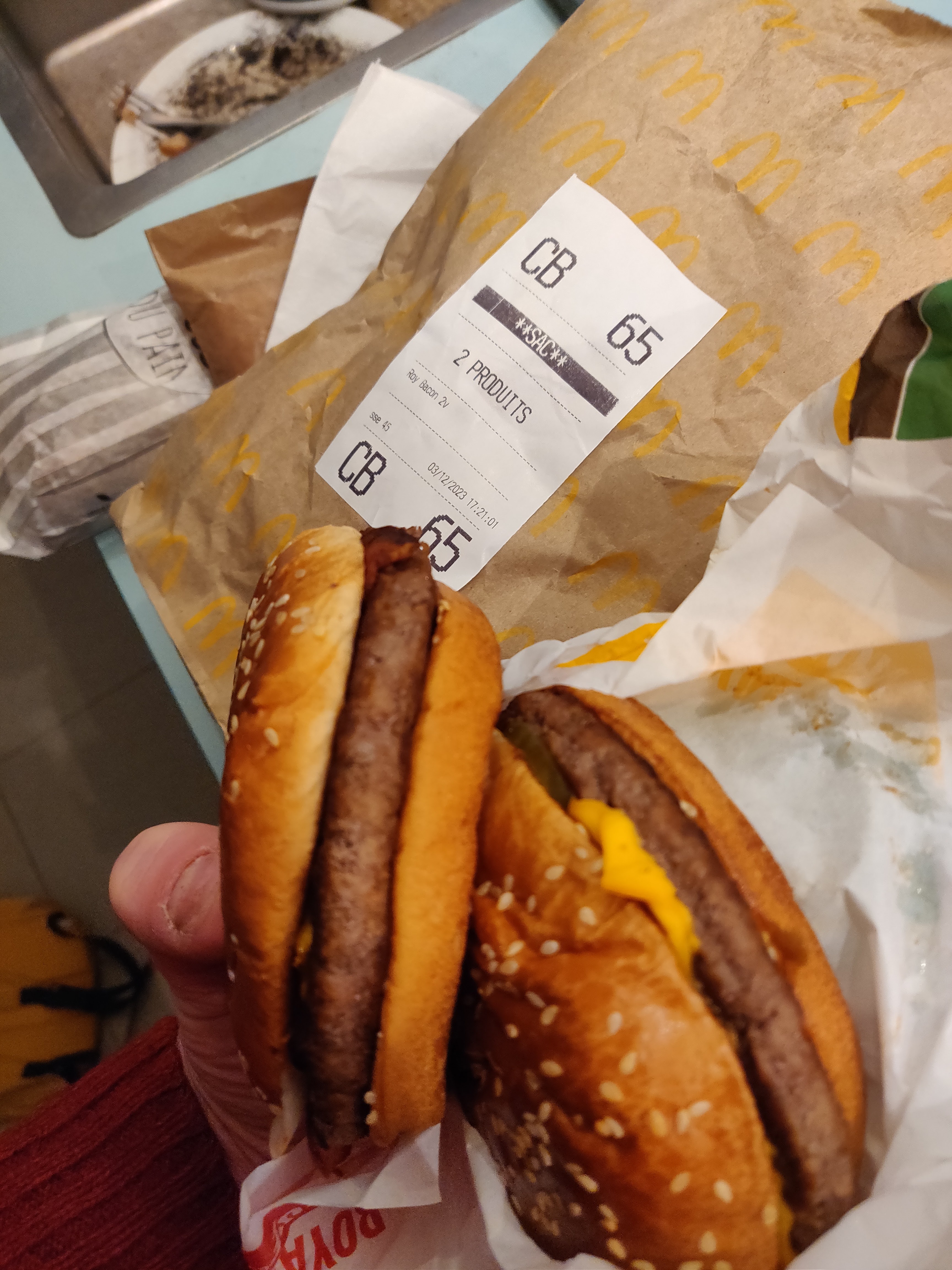 Des mois que n'ai pas mangé un Macdo et là ce soir je me fais un petit plaisir avec un bigmac, très déçu dès que j'ai ouvert la boîte, il manque un steak et une tranche de pain, le cornichon à côté du sandwich et le tout froid comme l'ambiance qu'on trouve là-bas. La prochaine fois j'irai plutôt au grec, moins chère et ils font des vrais burgers chauds... VDM