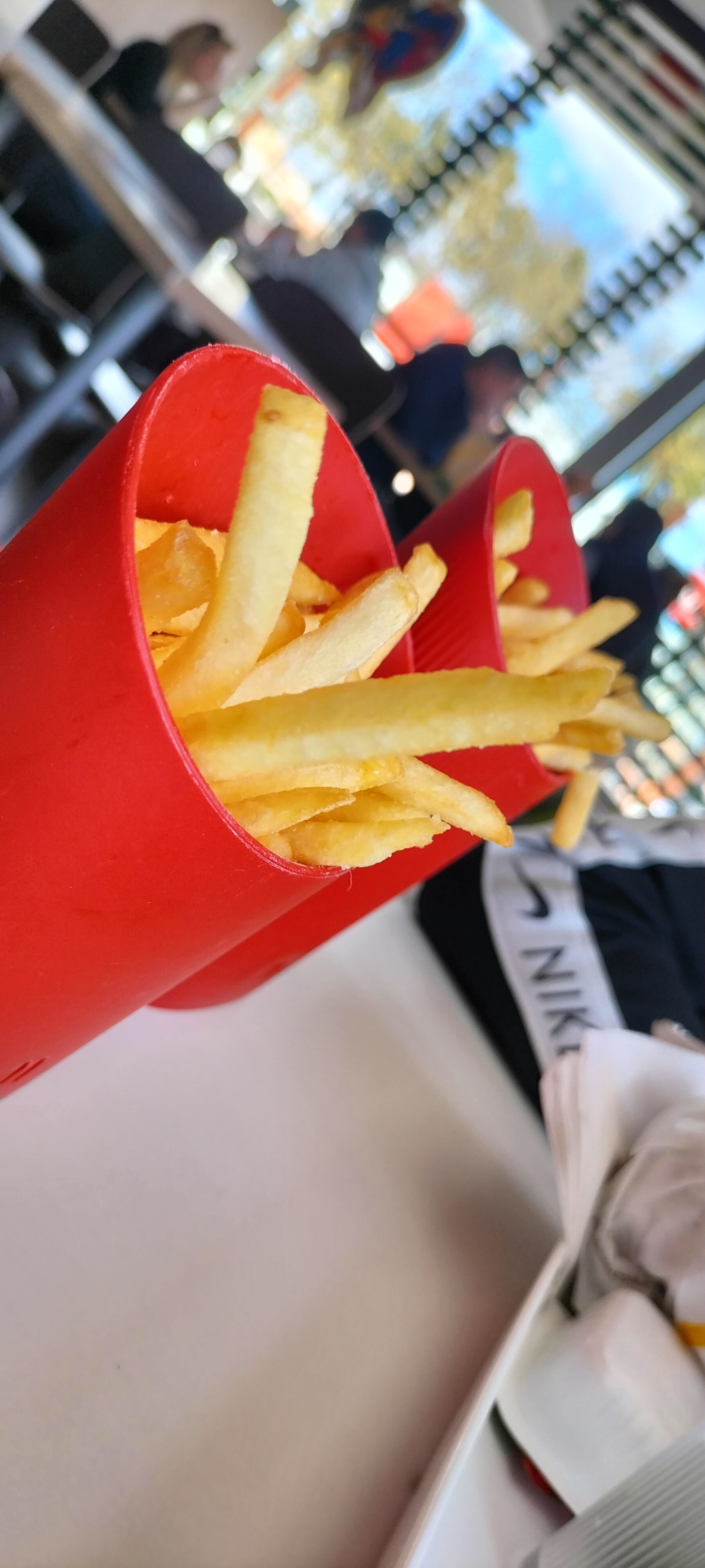 Vous de la fenêtre du drive le personnel renfoncer les frite dans la boîte alors qu’il ce touche le casque et le reste beurk 🤢