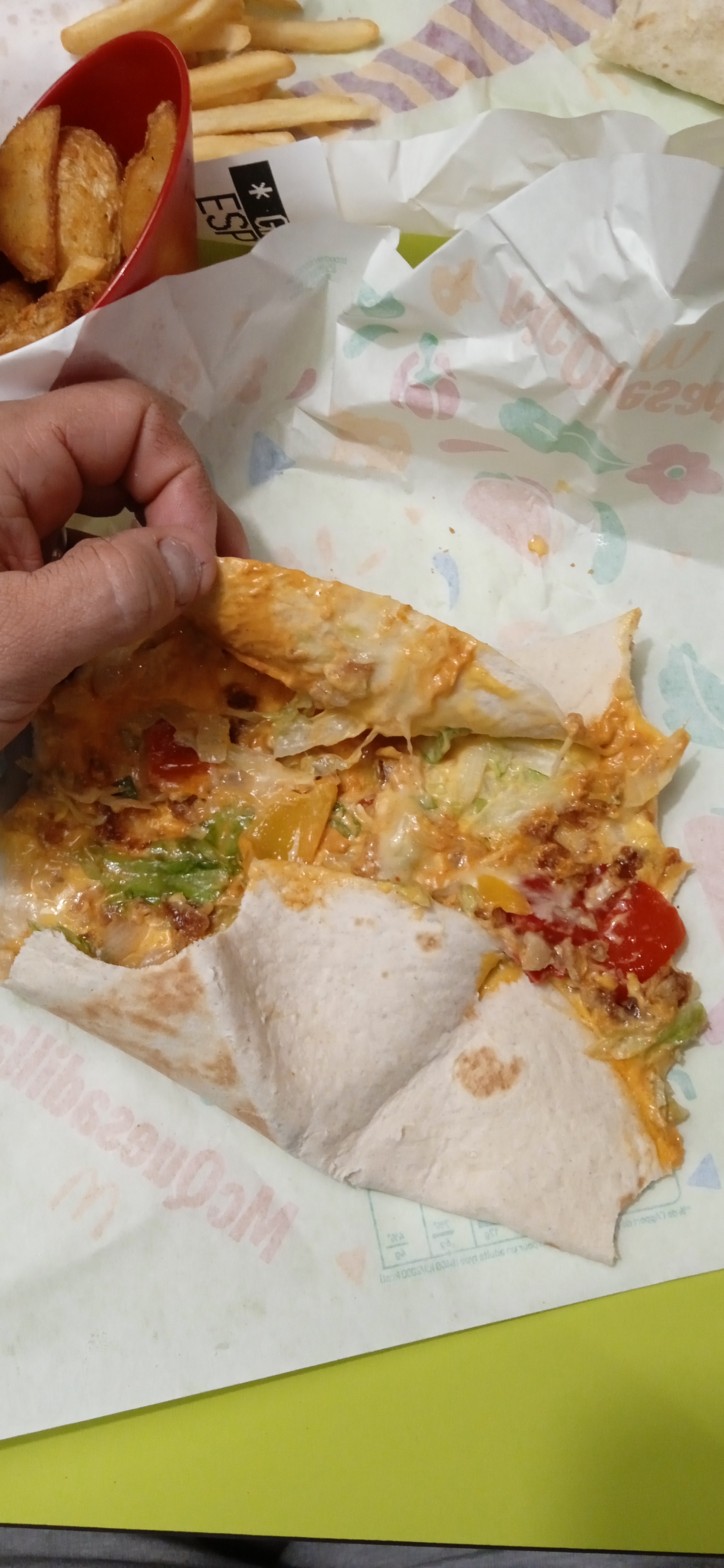 De pire en pire 😱😱 le Mc quesadillas qui est présenté fameusement sur les bornes où a la télé je l'ai testé ! Eh ben c'est une honte de présenté un sandwich comme ça au client surtout au prix où il est vendu !! Vous n'en avez pas du tout pour votre argent ! Voir photo ! De plus les potatoes ont un goût différents maintenant ! Pas bon... certainement dû au changement d'huile de cuisson. Un restaurant sale, toilettes dans un état lamentable, des déchets qui jonchent le sol, personnes pour les ramasser et surtout vider les poubelles archies pleines ! Bref de pire en pire...