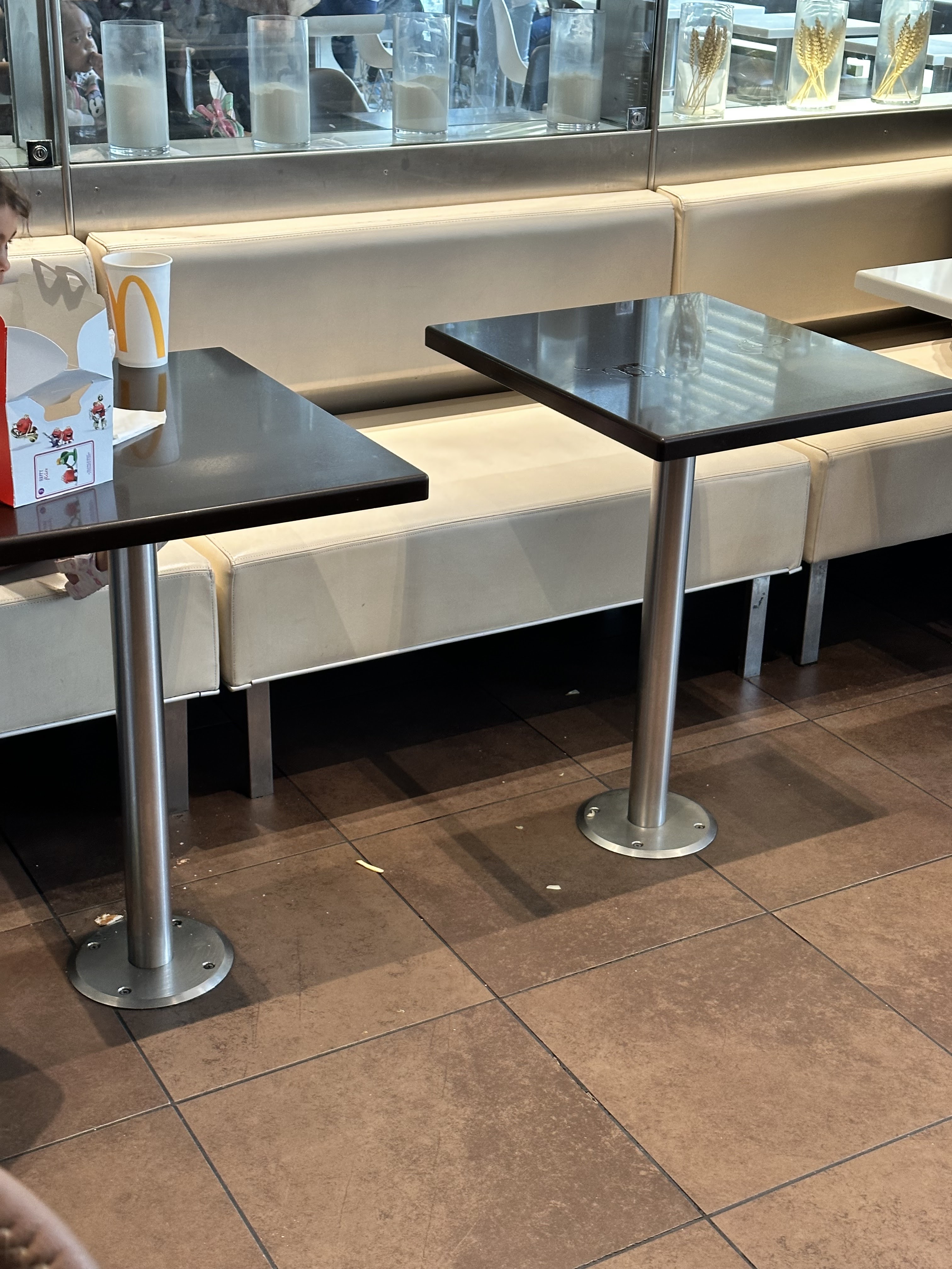 Mc Do toujours aussi sale même en milieu d AM un samedi. Les clients sont parfois irrespectueux des lieux mais l état des tables avec des dépôts alimentaires incrustés montre que le nettoyage est très mal fait. On est loin des standards de la chaîne.