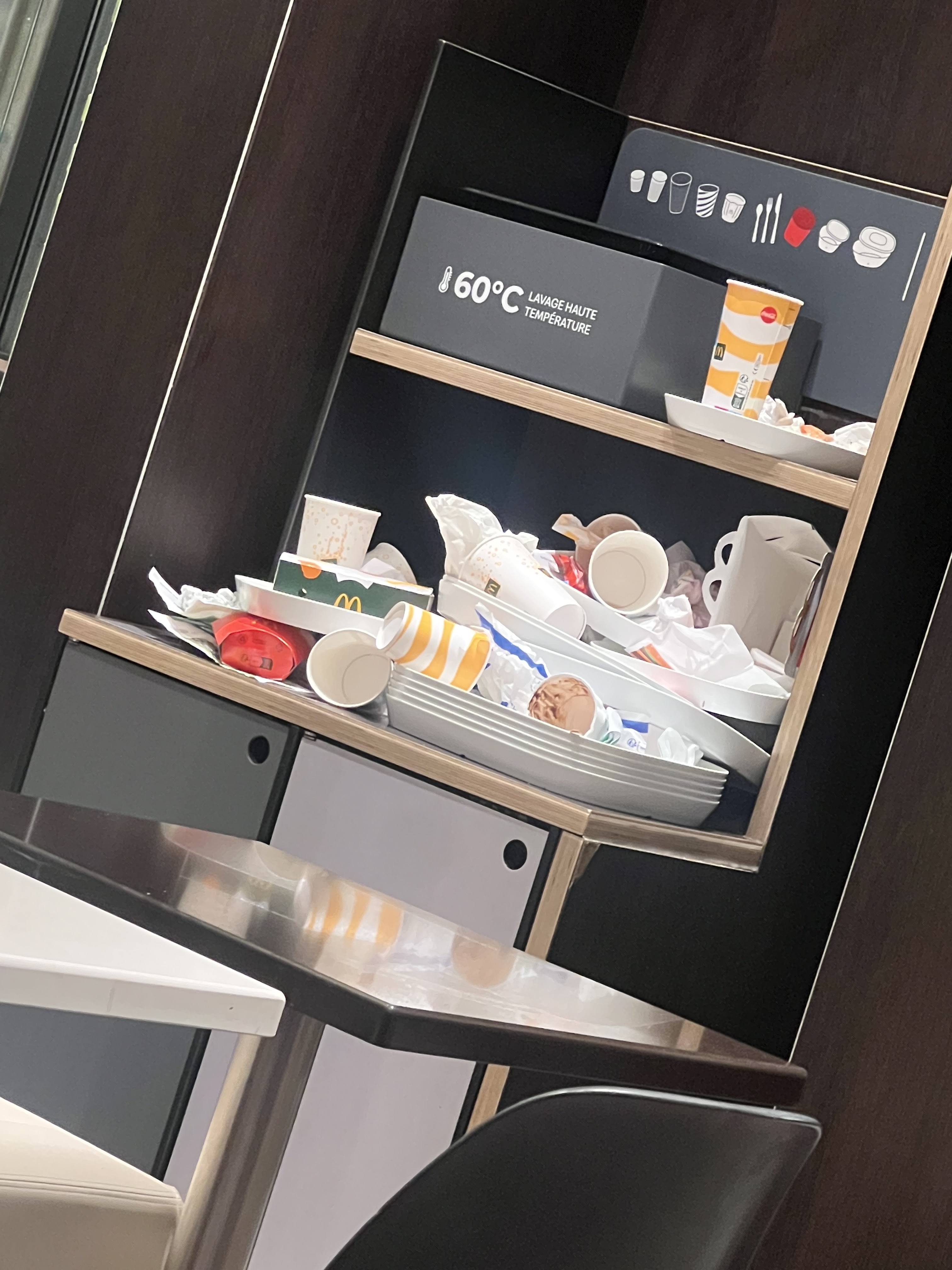 La moitié des bornes un samedi indisponible 😳 Manque d'hygiène sur les tables le sol. Beaucoup de monde même à 15h de l'après midi et une attente assez longue pour réceptionner notre commande.