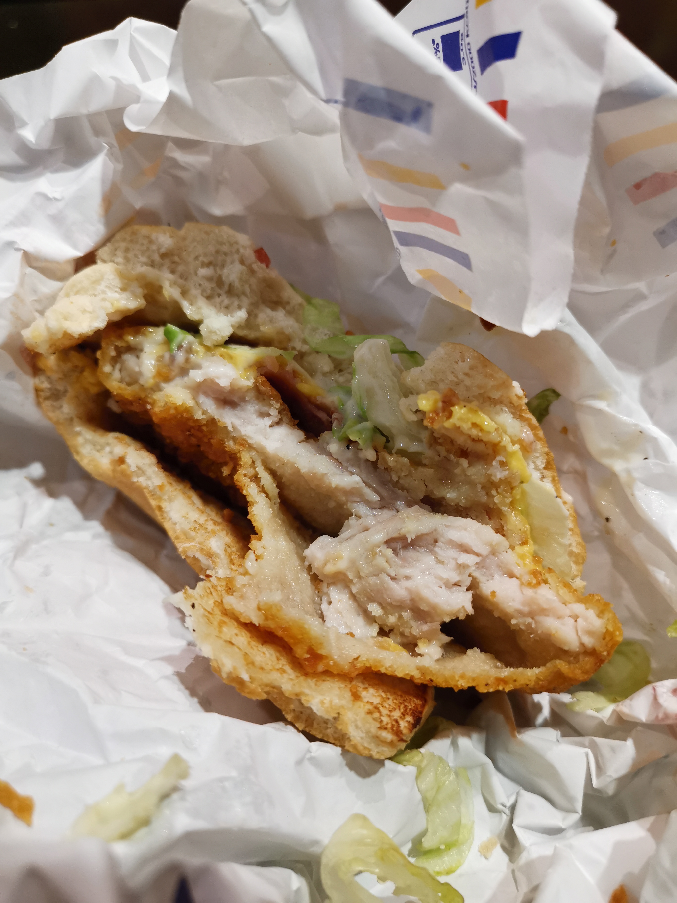 Les hamburgers au poulet et les nuggets ne sont pas comestibles car ils préparent la nourriture, stockent les plats cuits et réchauffent lorsqu'une commande est passée. Le poulet a un goût si rassis.