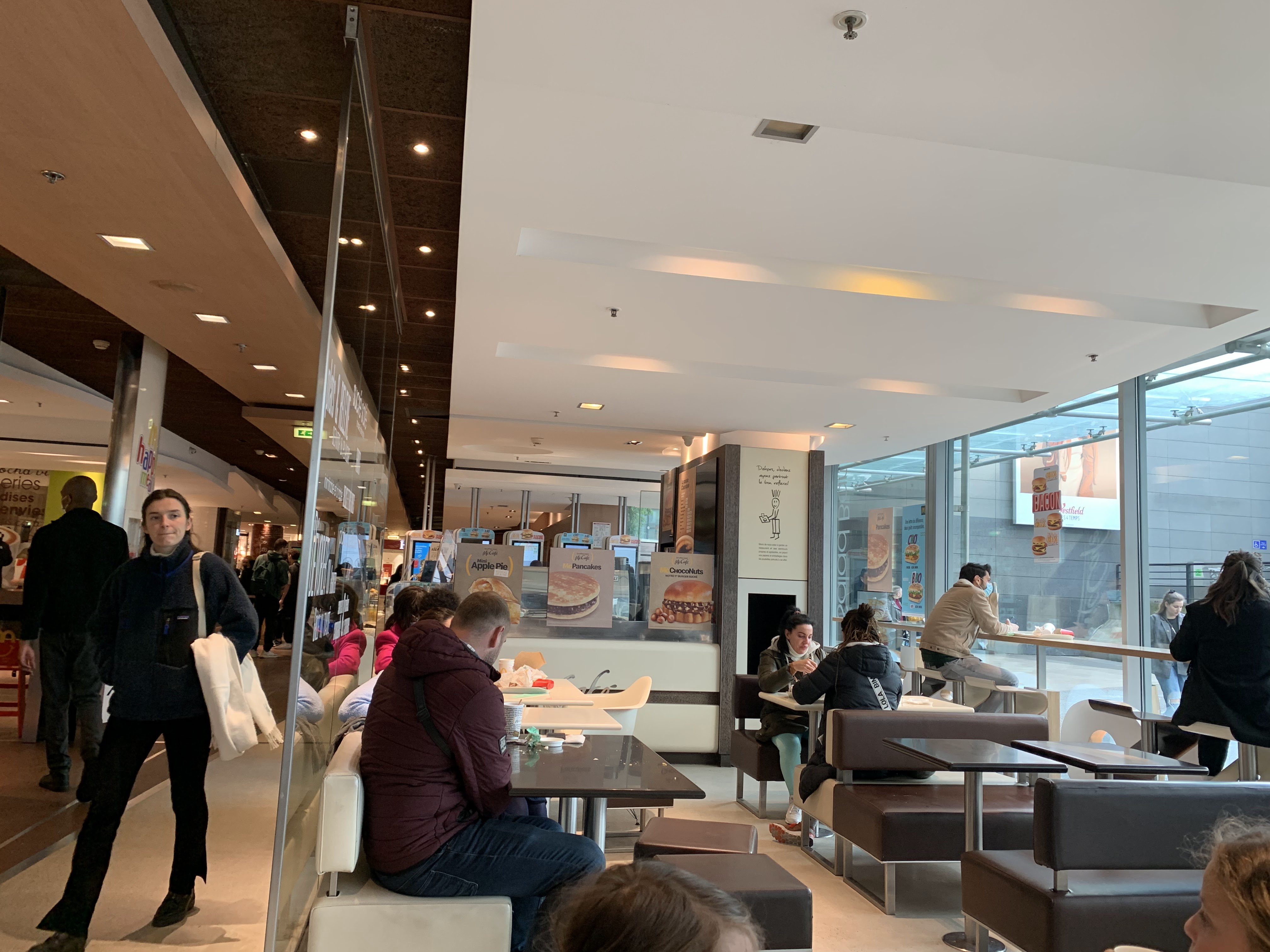 Les quelques fois où je suis passé, entre 12h et 14h, j'ai eu beaucoup de monde. Je trouve que les files ne sont pas très bien définies et on a l'impression d'être dans une foule, ce n'est pas agréable. Ce n'est pas mon mac do préféré. Ce Mac Donald's est grand, situé à l'un des angles du centre commercial, à côté de la grande Arche. Vous pouvez y accéder de l'intérieur ou de l'extérieur.