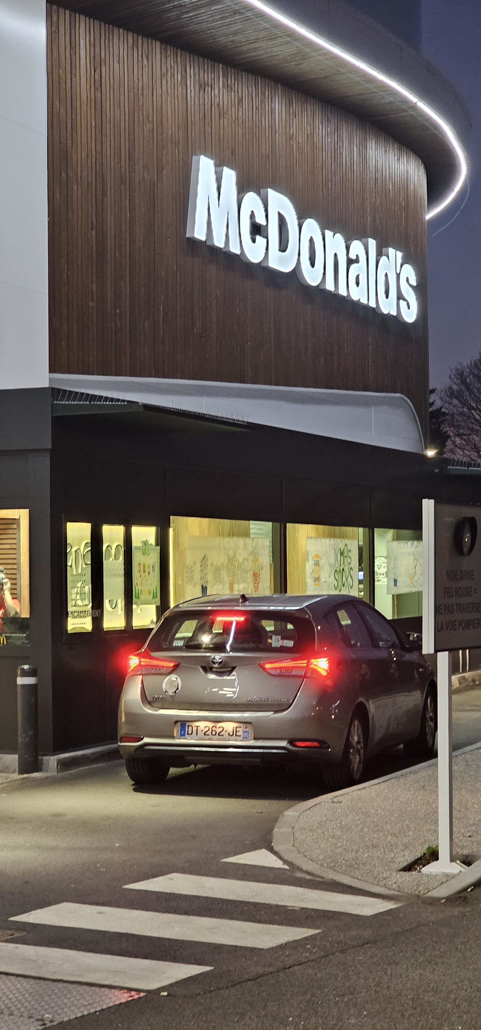 Je suis assez partagé car je suis venu un matin et c'était top de mangé sur place . Et j'ai tester le drive vers 19h et là c'était une catastrophe , très lent et en rentrant alors que j'habite à 2 min c'était froid et il manquait le dessert dans le happy meal et yavais eu une erreur dans mon menu .