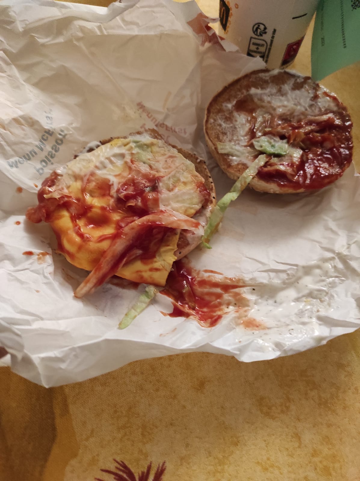 Plus de 3 fois que je commande au mcdo de Ermont et c’est de pire en pire, quand il manque pas un truc dans la commande, ils se trompe sur les sandwich, ou alors voilà l’état des sandwich ! Carrément j’ai eu le droit à ça + mauvaise commande pour un happy meal ! C’est bien beau de vouloir travailler vite mais se tromper tout le temps ou faire carnage dans les emballages, il me semble que l’on paye un service pour que ce sois fait correctement. Plus jamais ce restaurant