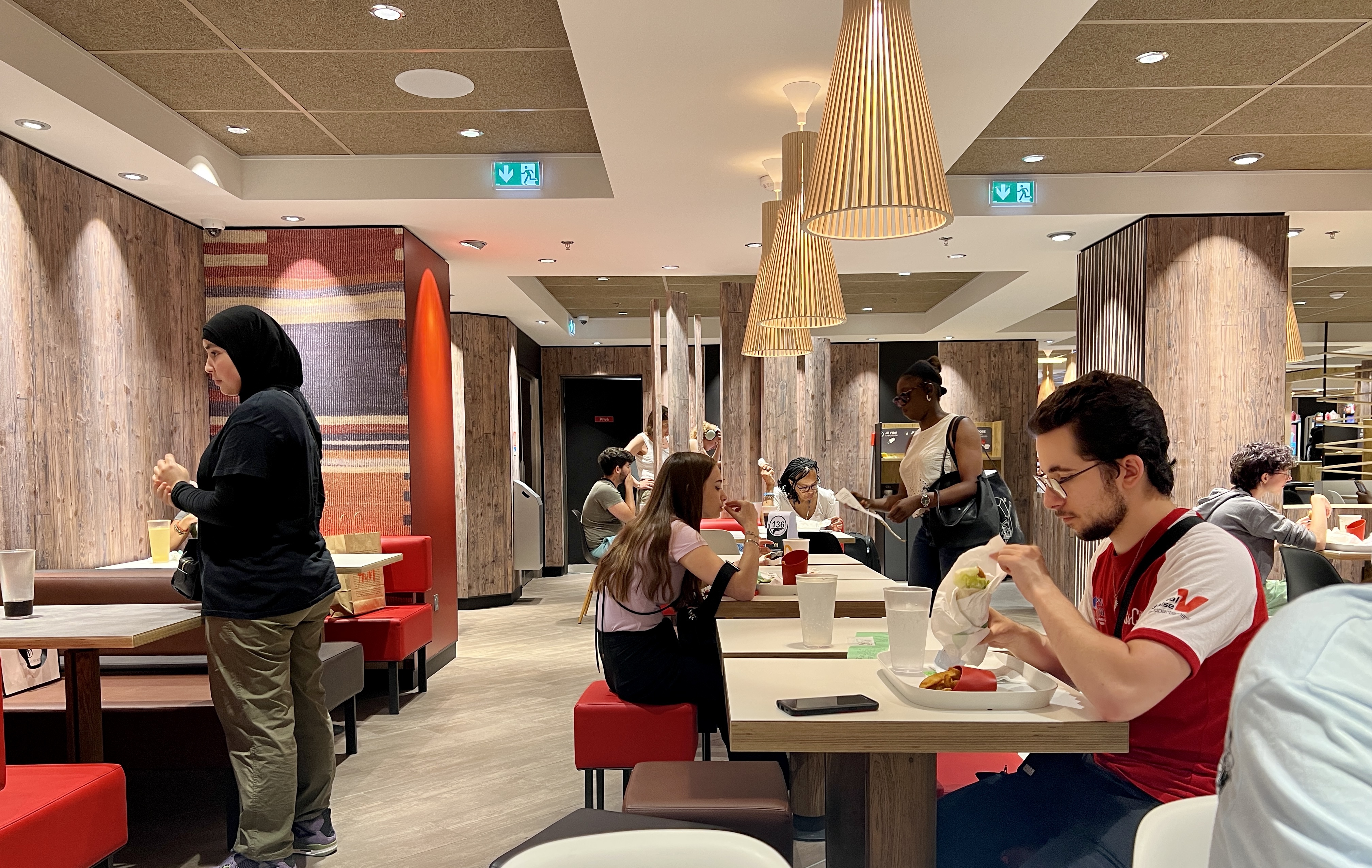 Bon, la nourriture est à peu près du niveau d'un McDo moyen. Par contre, les places sont vraiment trop petites (quand vous arrivez à en trouver une, en heure de pointe), le service à table ne sert qu'à attendre 5 minutes supplémentaires (le temps qu'il vous appellent 10 fois au comptoir, puis qu'ils se disent enfin que vous avez pris l'option du service à la place, et enfin le temps qu'ils vous trouvent dans le labyrinthe du restaurant). Pour les prix, on est clairement dans du très cher pour McDo. Les toilettes : j'y suis allé deux fois, elles sont juste immondes.