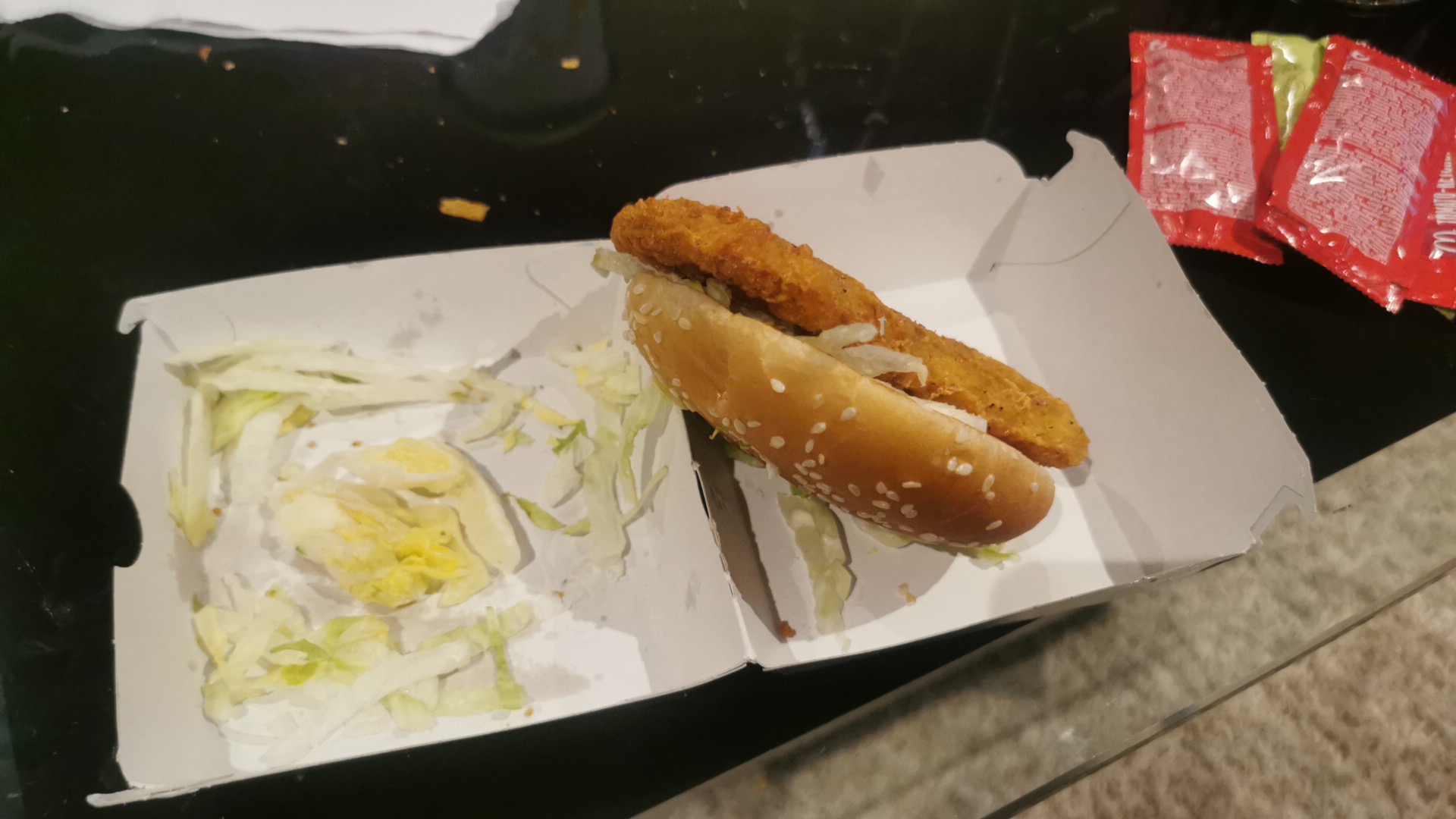 Mcchicken commandé, à la place biscotte (pain laissé au toaster trop longtemps ) sans aucune garniture ( pot de sauce vide certainement et le fdp en cuisine n'a pas jugé bon de changé pour faire un sandwich correct), la salade je n'en parle pas , un peu moins et on part sur un sandwich nature, encore une fois un bon gro sfdp que j'éclaterais volontier si je savais à qui j'avais à faire devant toute son équipe.