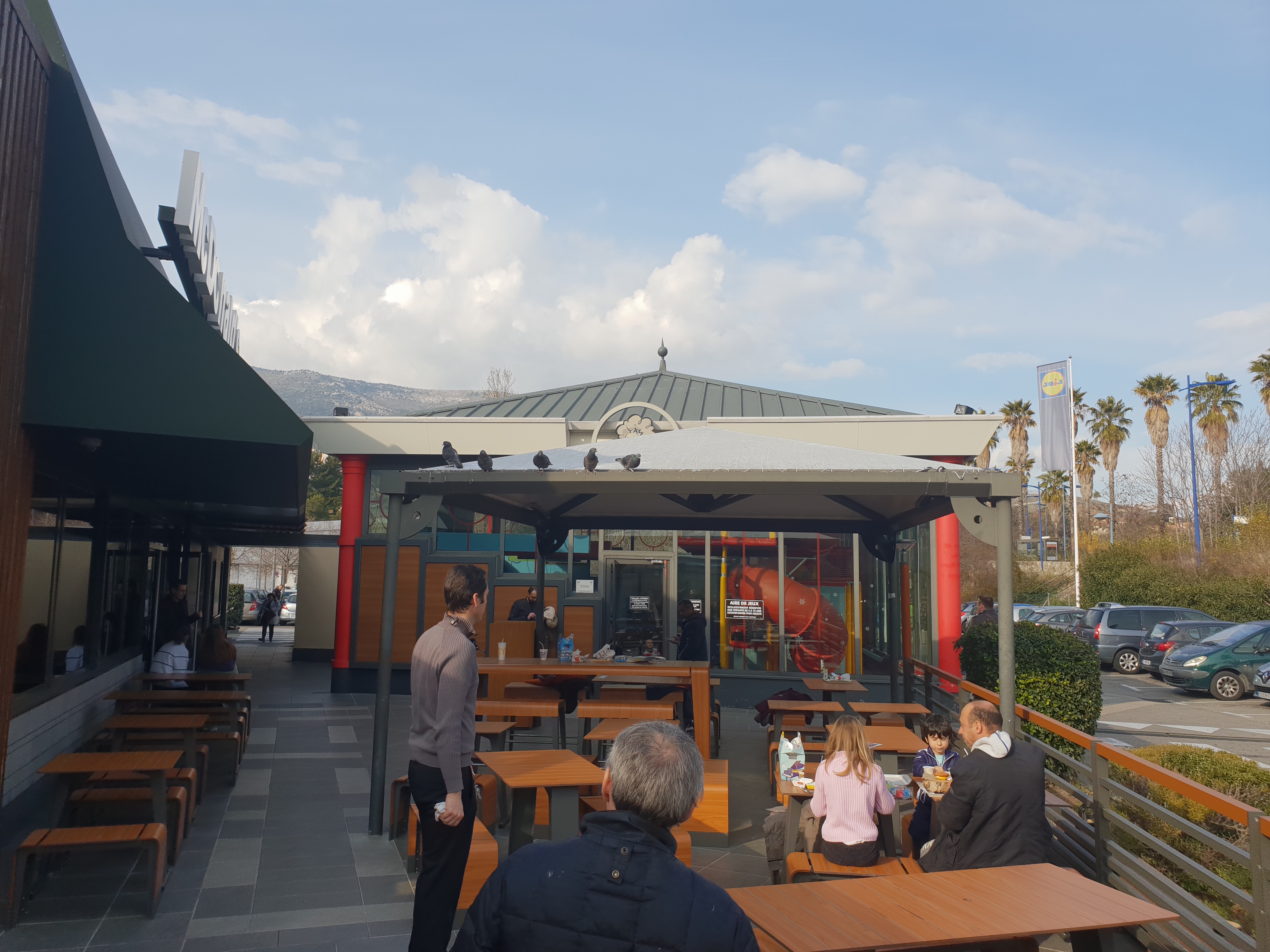En comparaison avec ceux de saint Laurent du Var (2) , et , celui du Lingostière (carrefour) ... La salle du restaurant est propre (sol et tables) La file d'attente est correct Possible de se restaurer a l'extérieur L'espace de jeux semble sympa (mais fermé lors de notre visite) L'équipe est notamment et aussi constituée de personnels plus âgé ce qui semble favorisé la bonne tenue de l'établissement . Même au drive, il est rare qu'il manque un produit !!!