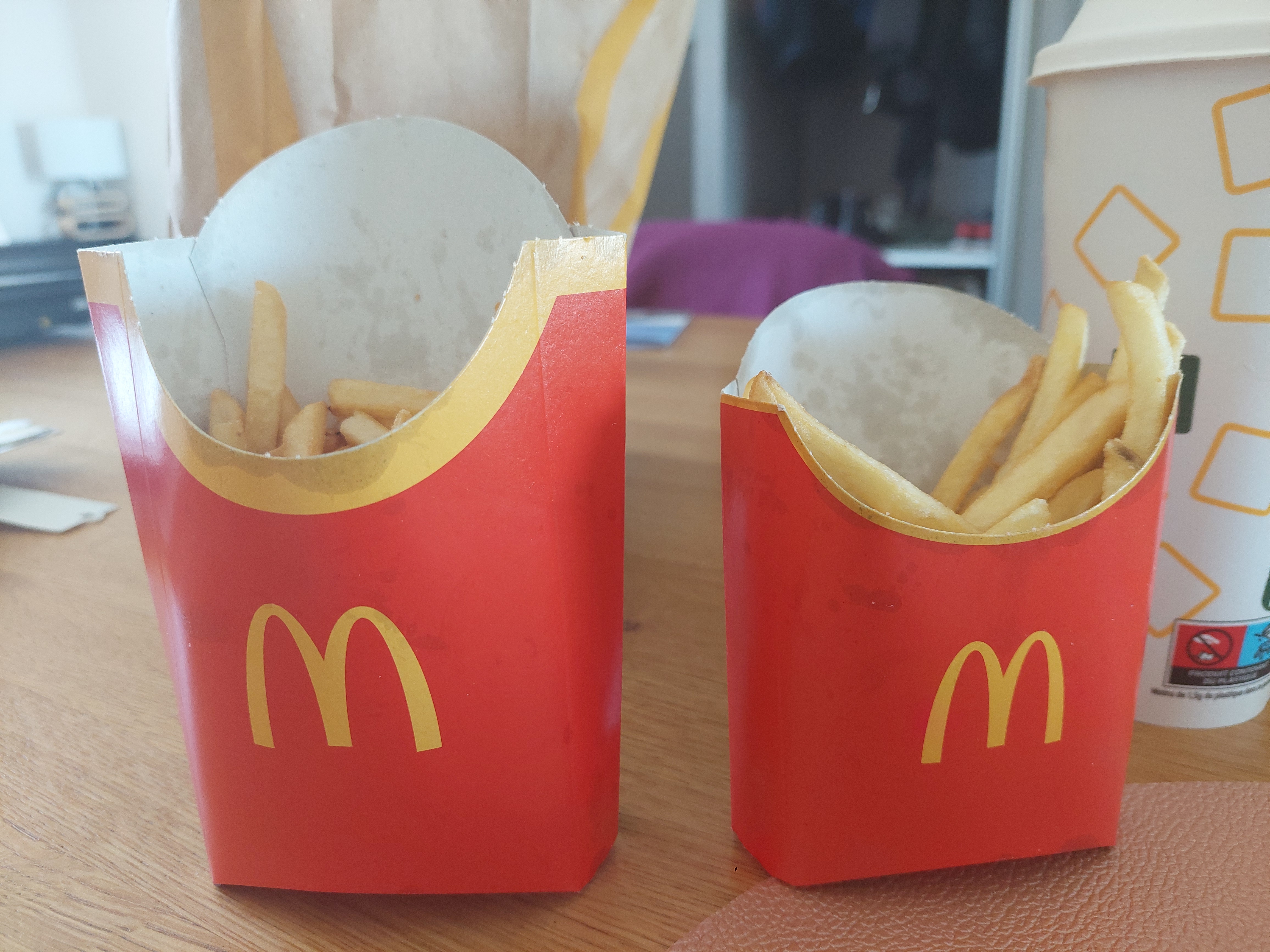 alors pas de frites personne pour réclamer se n'est pas la première fois l'autre fois les donuts parfois les sauces un mac do sans frites sa le fait pas bref comme on peu pas réclamer on fait quoi frite maison une restauration ou on peu pas réclamer c'est pas normal bref sa nous a gâché notre repas une menu sans frites c'est plus un menu sa risque pas de se reproduire ont reviens pas quand on se fait escroquer