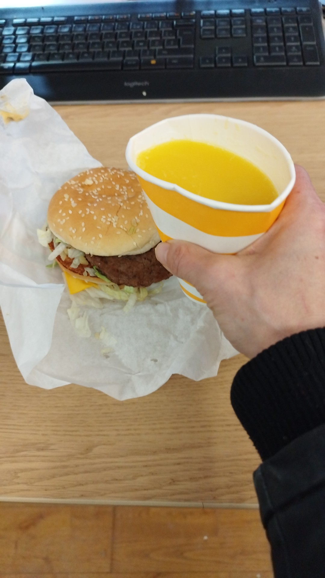Pris au drive un menu chiken big tasty les potetos très bien l'ice tea chaud servi sans glaçon et j'ai eu un big tasty avec du bœuf à la place du poulet en plus service en peu long au drive mais je comprend il y avait du monde mais respecté la commander au moins.