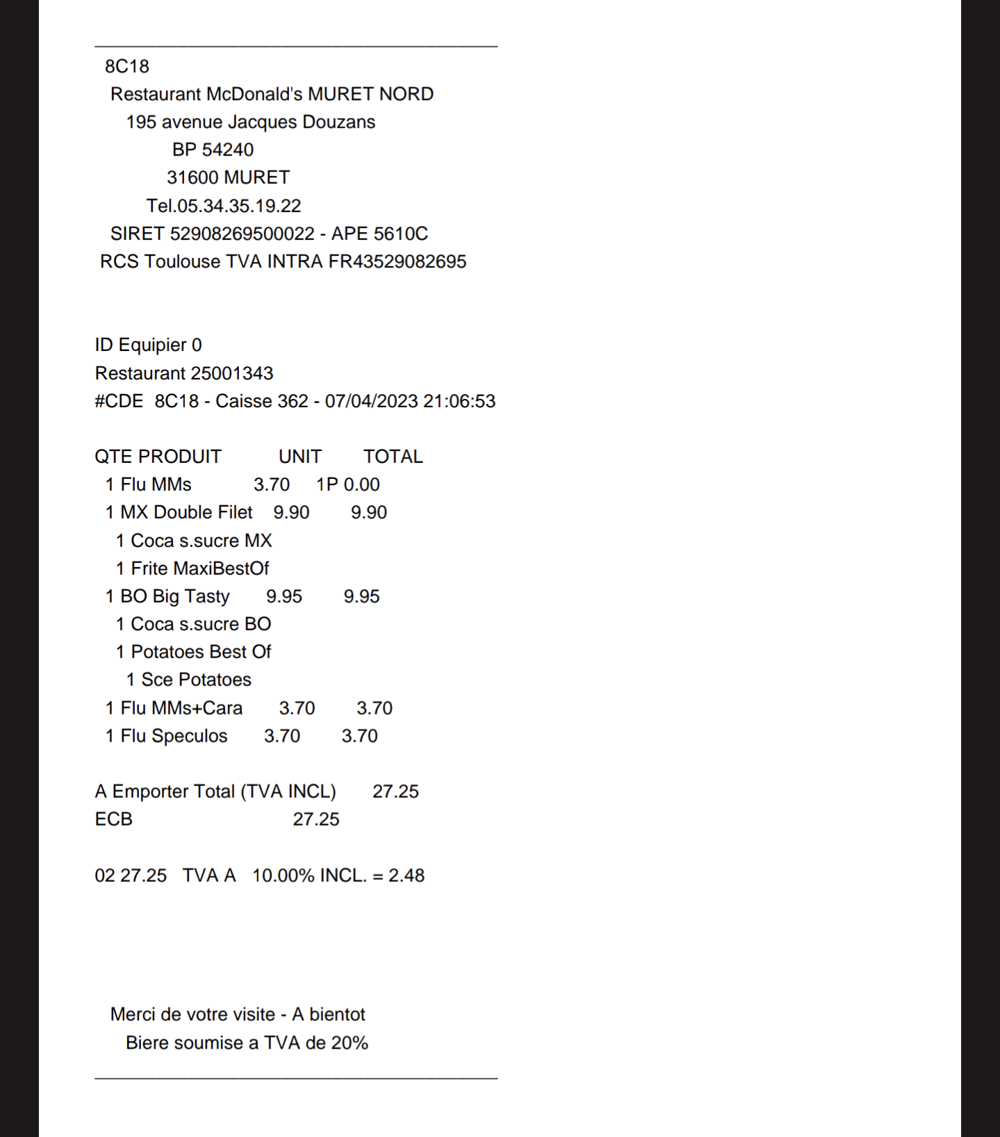 Pour une fois je vais commenter ! D’habitude il manque les sauce là ce soir ce son les serviettes (pas bien grave ) mais là je commende déjà 20 25 minutes au drive, je commande un menu MAXI BESTOF double chees frite coca Mc Fleury caramel et je me retrouve avec quoi 1 chees simple pour le prix sérieux abusé !! Je ne voulais plus y aller à muret et je pense que là je dit stop !