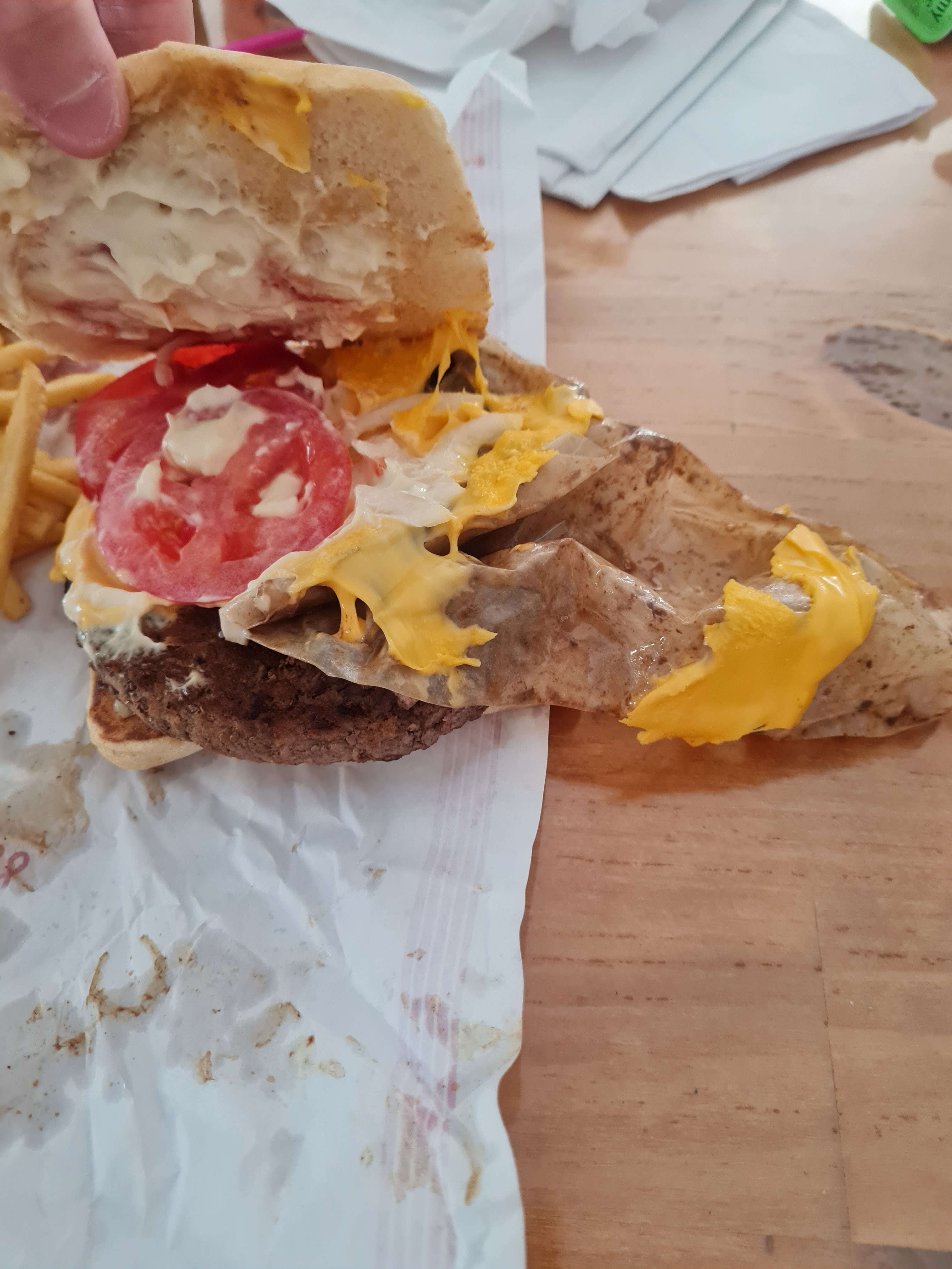 Très en colère !!! Je commande toujours à ce macdo qui me déçoit de plus en plus mais alors la c'est le ponpon!!! Un énorme bout de plastique dans mon sandwichs juste envie de vomir 😡😡🤬