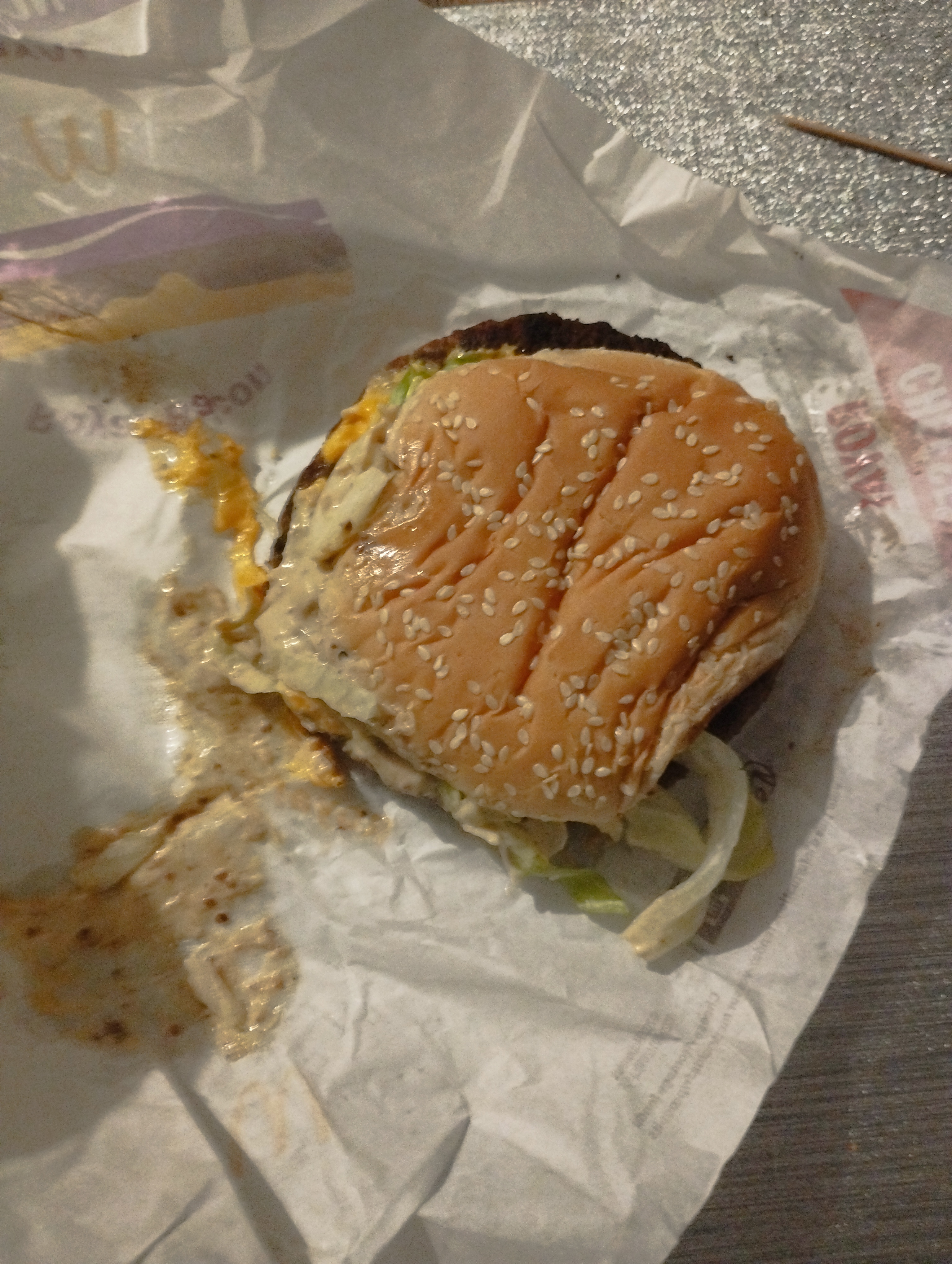 Nous allons au MacDo une fois par an, et encore ! A petite dose c'est acceptable. Mon Big tasty, bien que bourré de sauce mayonnaise, n'était pas mauvais. Les patatoses restent toujours aussi bonnes. Le bémol du jour ce sont les toilettes, ça embaume comme ceux de l'armée, malgré un aspect à peu près net... Le reste de l'établissement est en revanche parfaitement propre et agréable, ouf !