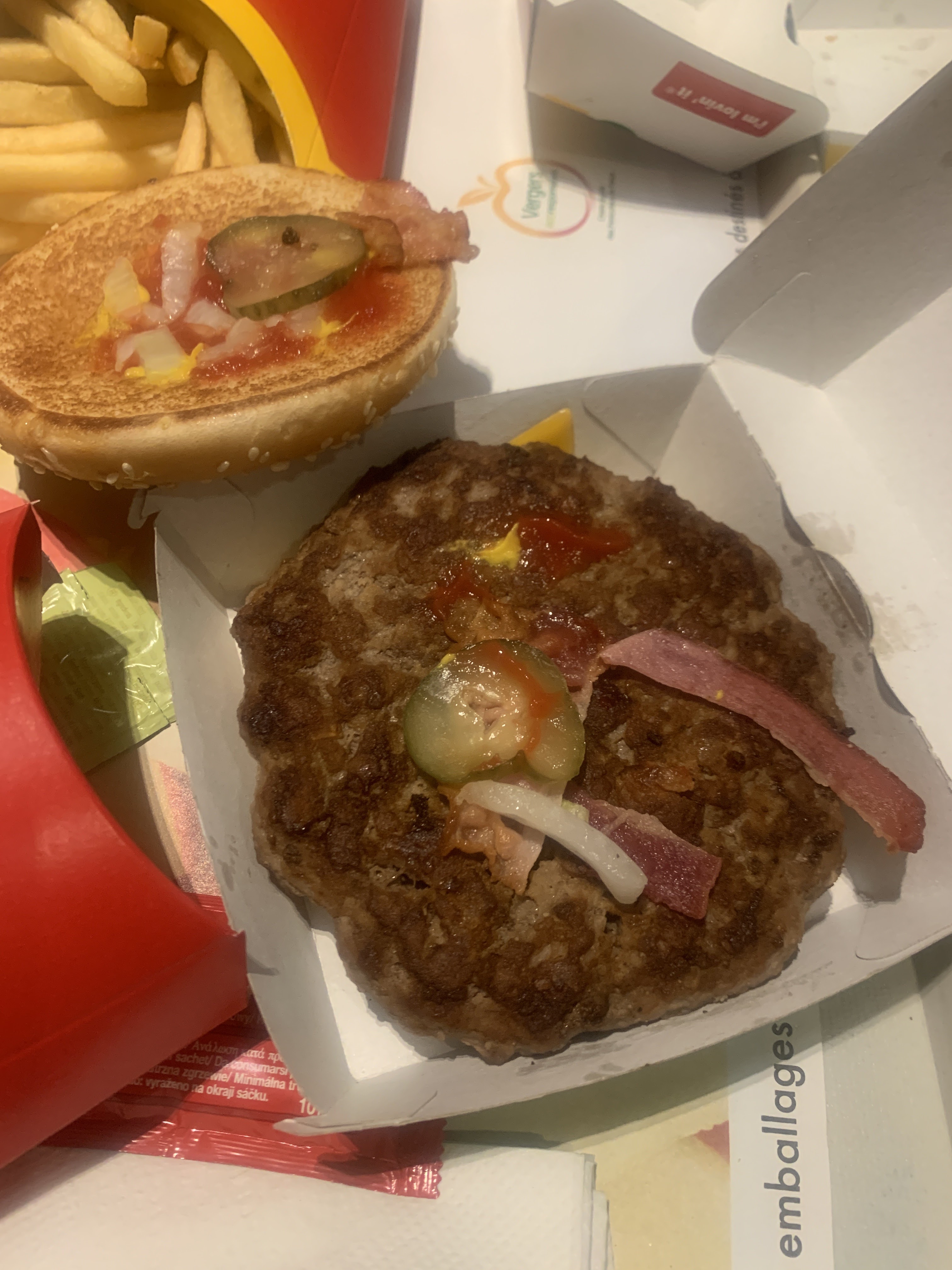 Nous sommes allés le dimanche 09 février 2020 au soir , j'ai commander un bigmac Et LÀ !!!?😓 un big!! Mac!! 🍔🍟Le burger qu'on vient manger au MacDo. Je ne félicite pas le (la) chef d'équipe ce soir là!!!! Je l'ai manger 😵😩j'avais très faim mais vraiment pas bon!!!!!! heureusement qu'il y avait les frites.
