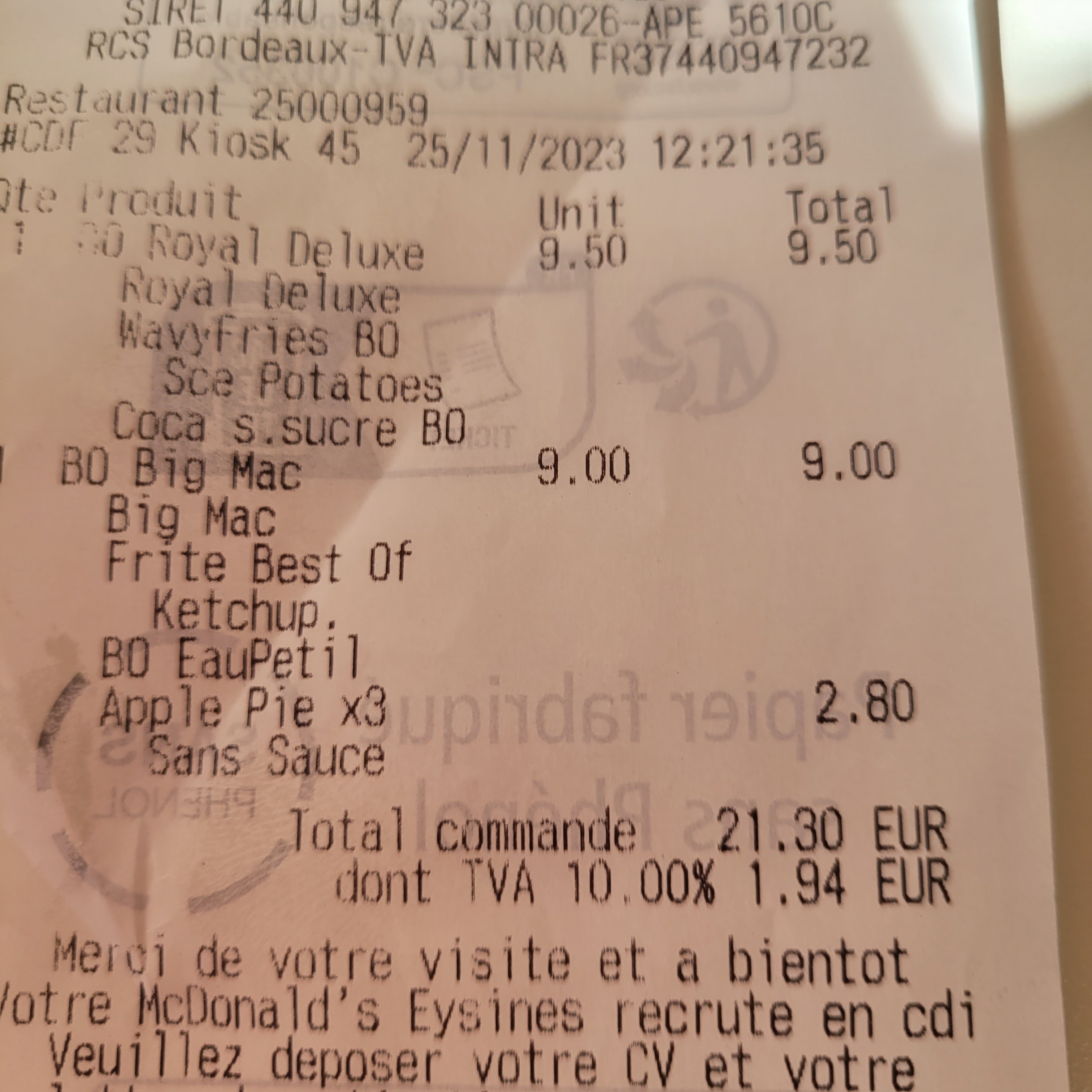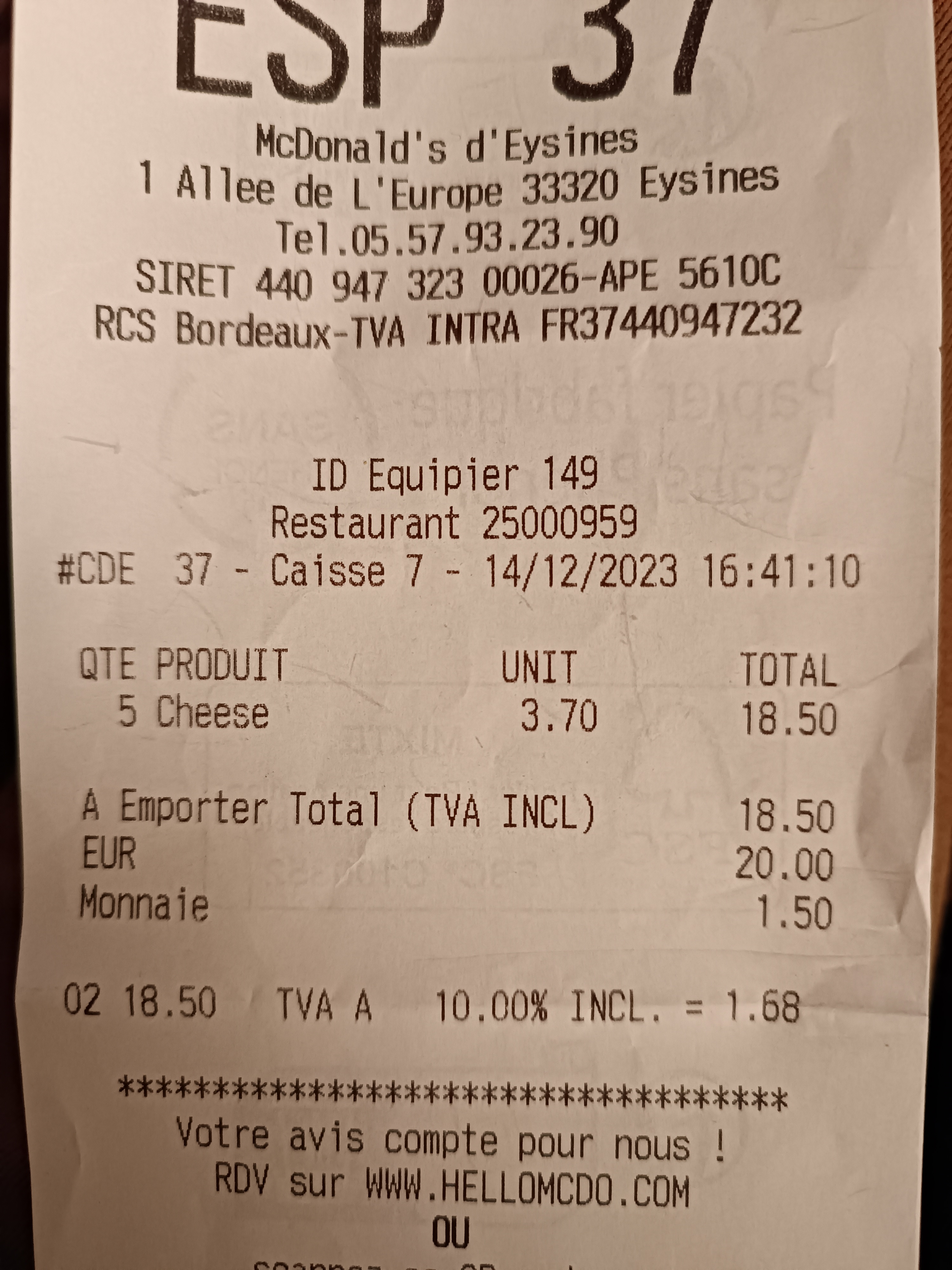 Choquée par les prix... Je suis habituée à voyager et, dans un autre pays de l' UE j ai commandé la même chose l'autre jour et pas à ce prix exorbitant...et là à Eysines, j'hallucine sur le prix des cheeseburgers... Un cheeseburger facturé à 3'70 e... Bref pour moi c'est du vol... Si j' avais pu annuler la commande je l'aurais fait... Pas osé...Je ne viendrai plus... Ce prix est à mon avis exagéré... Je prends ça pour faire une collation rapide sachant que bon c'est pas non plus un repas dans un grand restaurant. Bref je préfère faire mes sandwichs, là ça devient du luxe... Au revoir, j espère que d autres personnes auront aussi une ouverture de conscience sur le fait que nous ne sommes pas des pigeons....