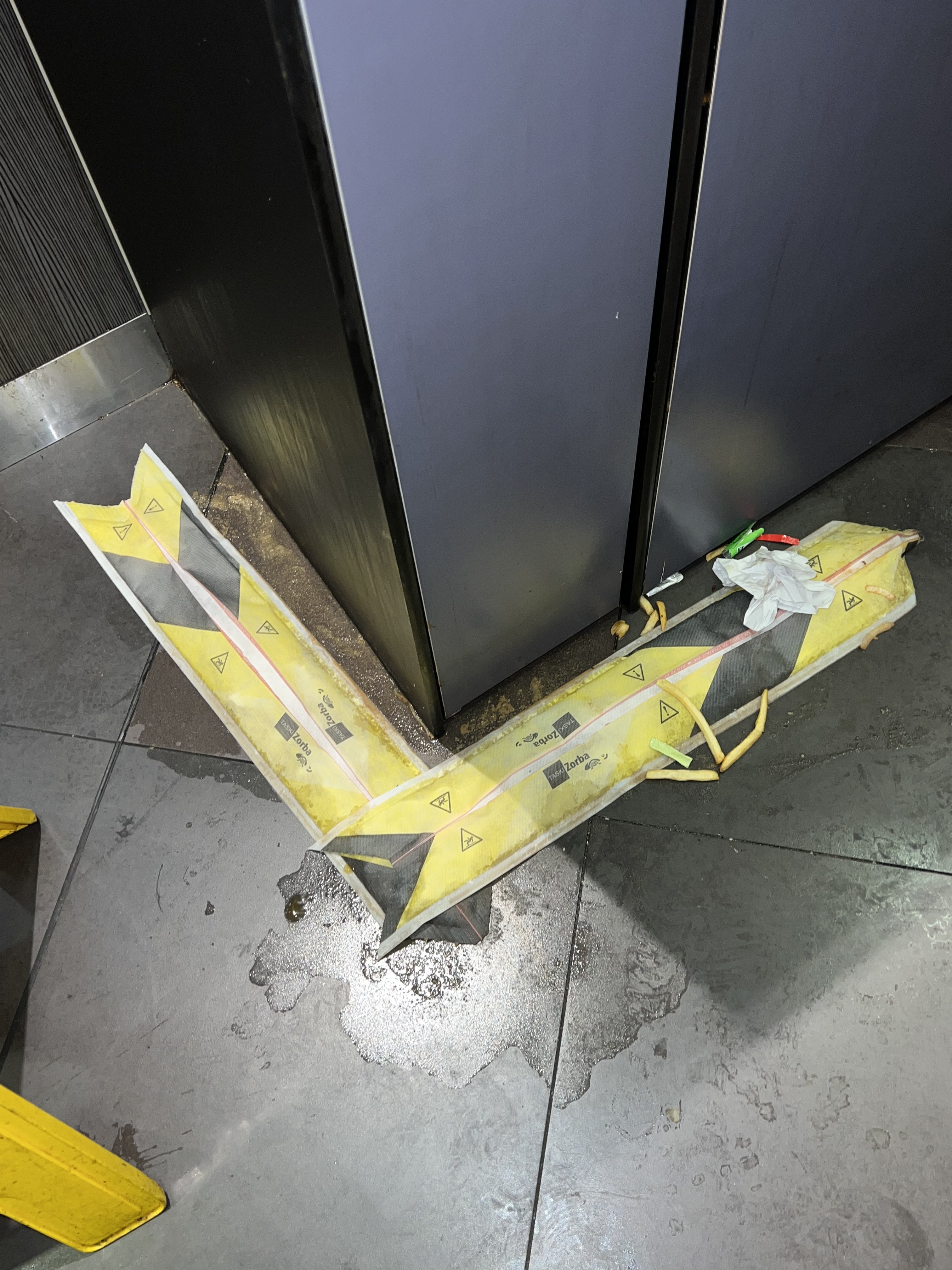 Une borne de commande sur deux et le personnel n'accepte pas les commandes au comptoir. Le gel désinfectant sent l'urine. Séchoir aux toilettes HS. Quantité frites minable. Cheveu inclu dans les frites. Coulis de gras sur le support. Update : la frite a été remplacé suite à signalement, néanmoins il s'agissait toujours d'une petite frite comme vu sur la photo au lieu d'une grande comme commandée.