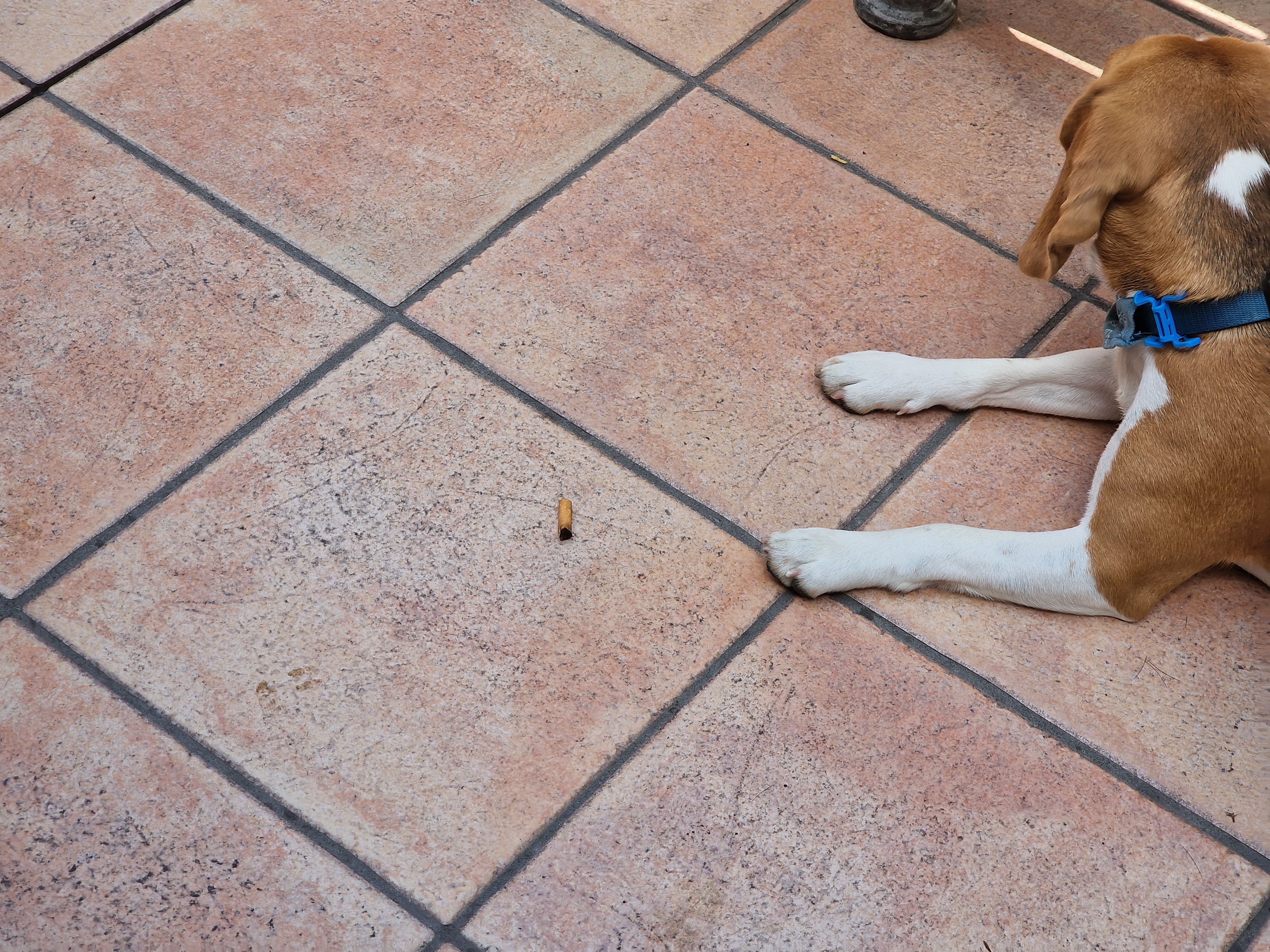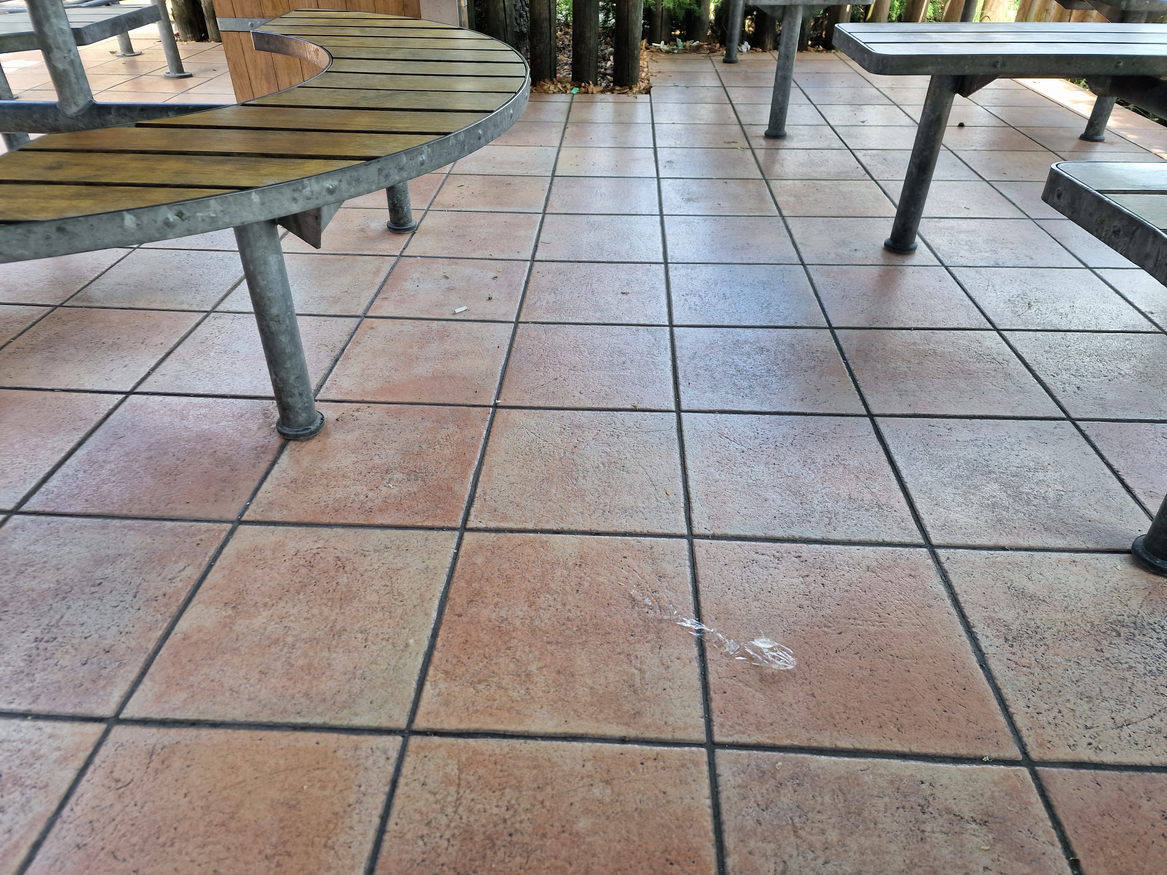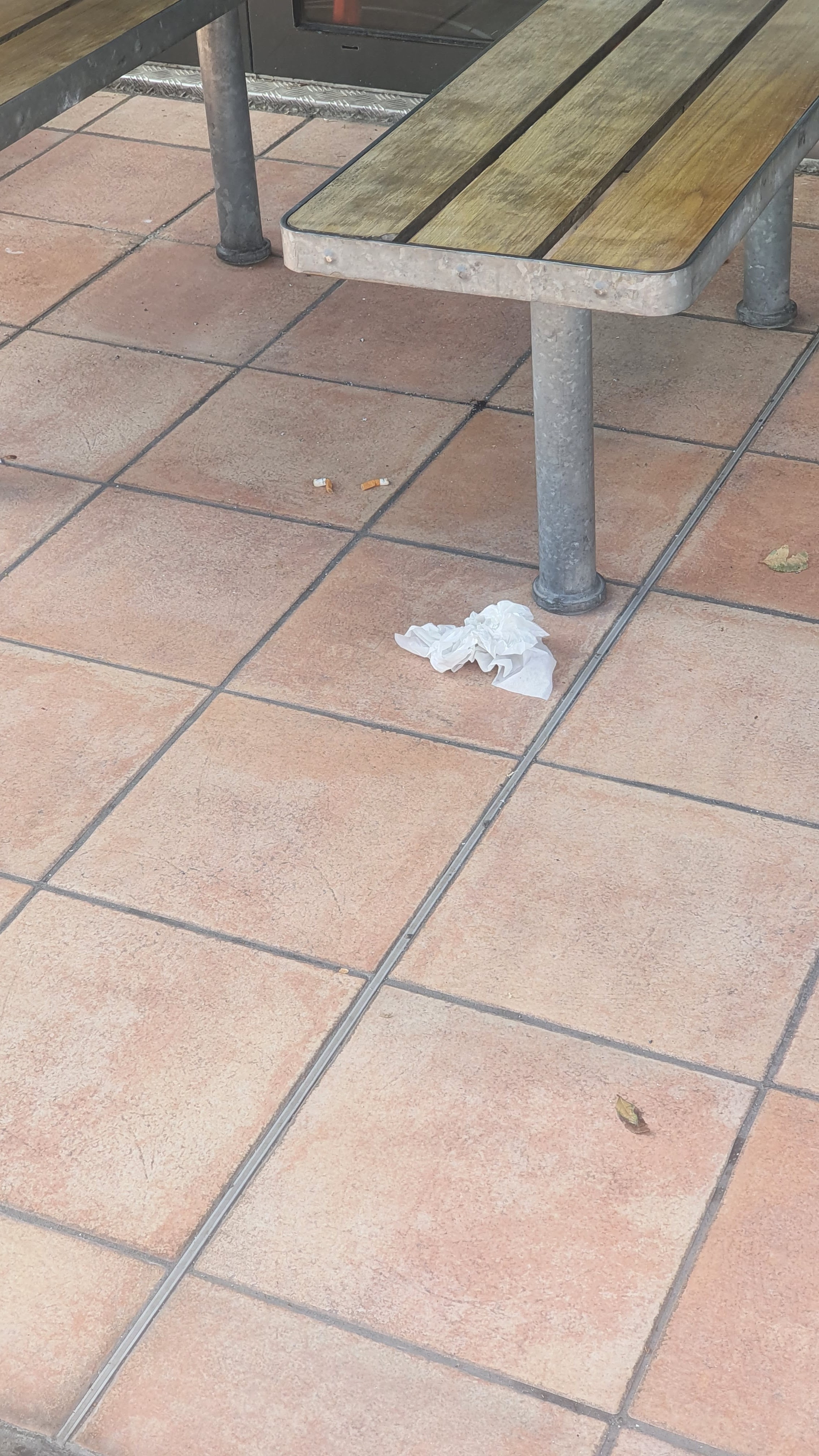 La terrasse est tellement crade que notre chien a sûrement mangé plus que nous, sans parler du tabagisme passif dû en grande partie aux employés... La honte