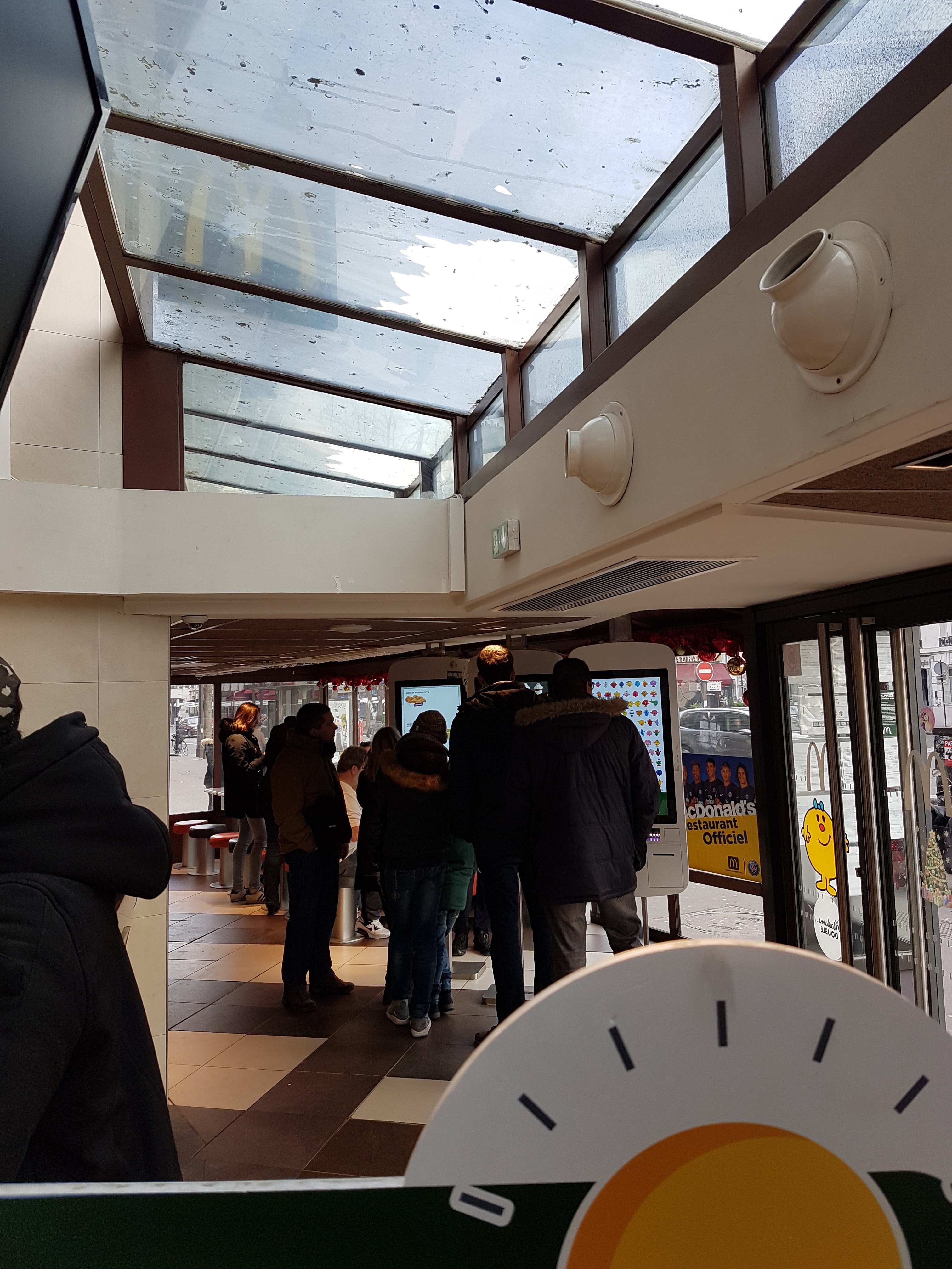 Lent à produire la nourriture. Cela semble être un problème de McDonald's français. Pas assez de personnel car c'est trop cher de les embaucher, j'imagine. Allez robotique, dis-je. Quoi qu'il en soit, la lenteur faisait que la chantilly de mon café viennois avait fondu. Ce n'est pas grave. La nourriture était suffisamment savoureuse. Ce n'était pas si bon marché.