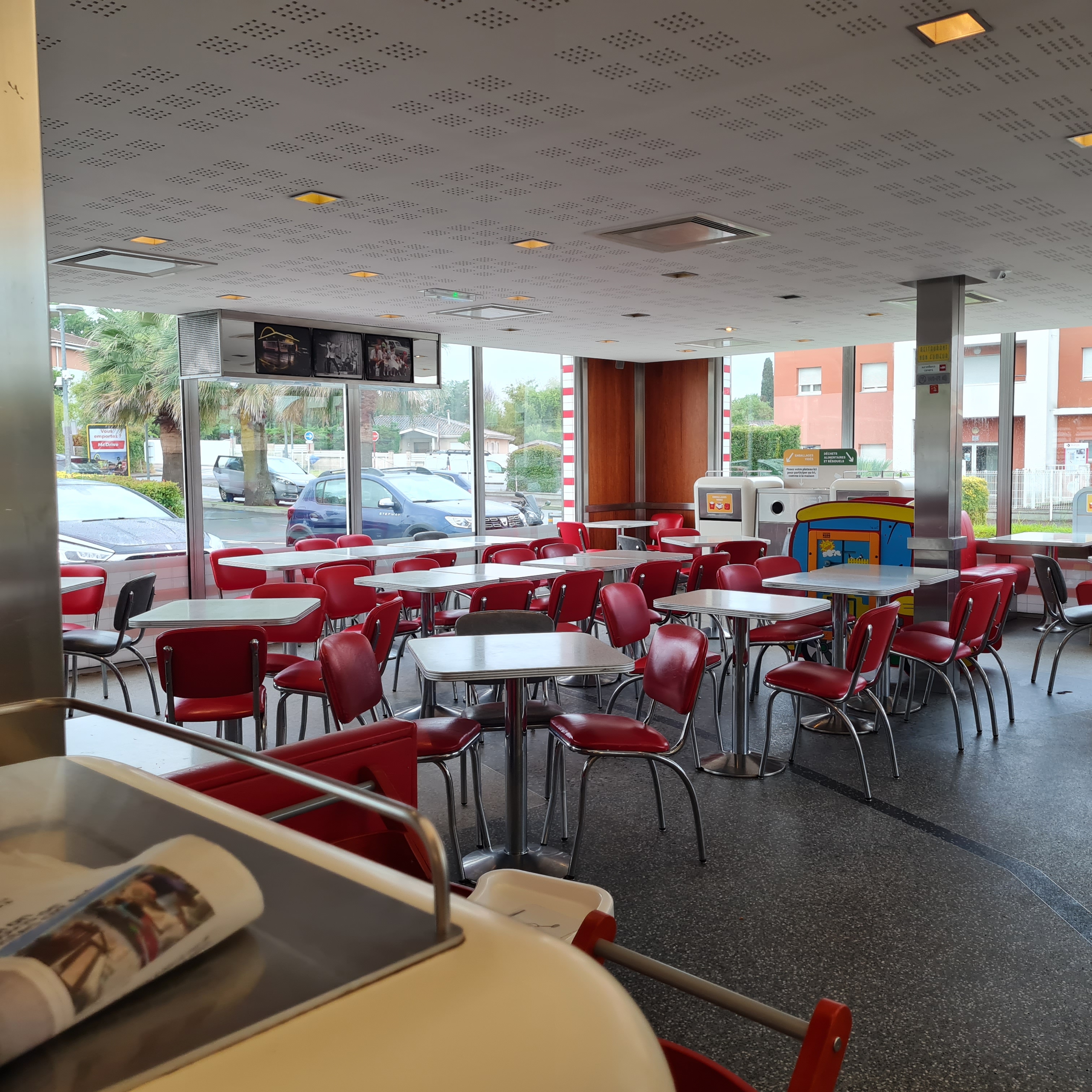 Cela reste du macdo, mais c est de loin mon macdo préféré avec son design, sa superbe cadillac rose et sa deco retro, attention au piege du drive qui est souvent bondé alors qu il vaut mieux se garer et commander a emporter a l interieur en profitant de la deco il ne manque que les serveurs en patin a roulette