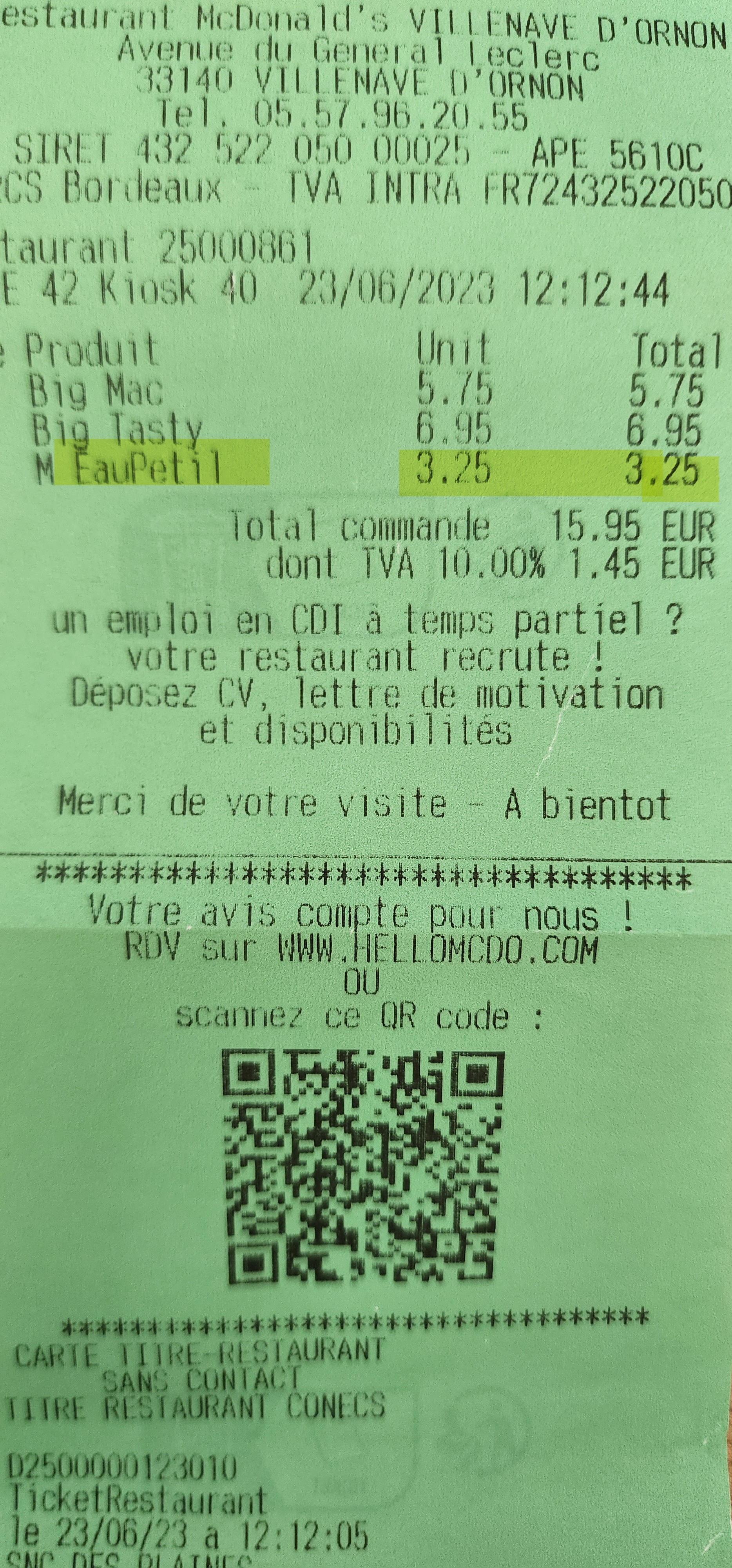 3,25 € pour un verre d'eau pétillante, de la vulgaire eau du robinet filtrée et gazéifiée, c'est une honte. J'ai posé la question au serveur sur le pourquoi de ce prix exorbitant et il n'a pas su me répondre. Vous trouverez la preuve dans la photo ci-jointe. Il est à noter que dans les autres McDonald's, ce même produit est à 1,00 €. Je ne retournerai plus dans cet établissement.
