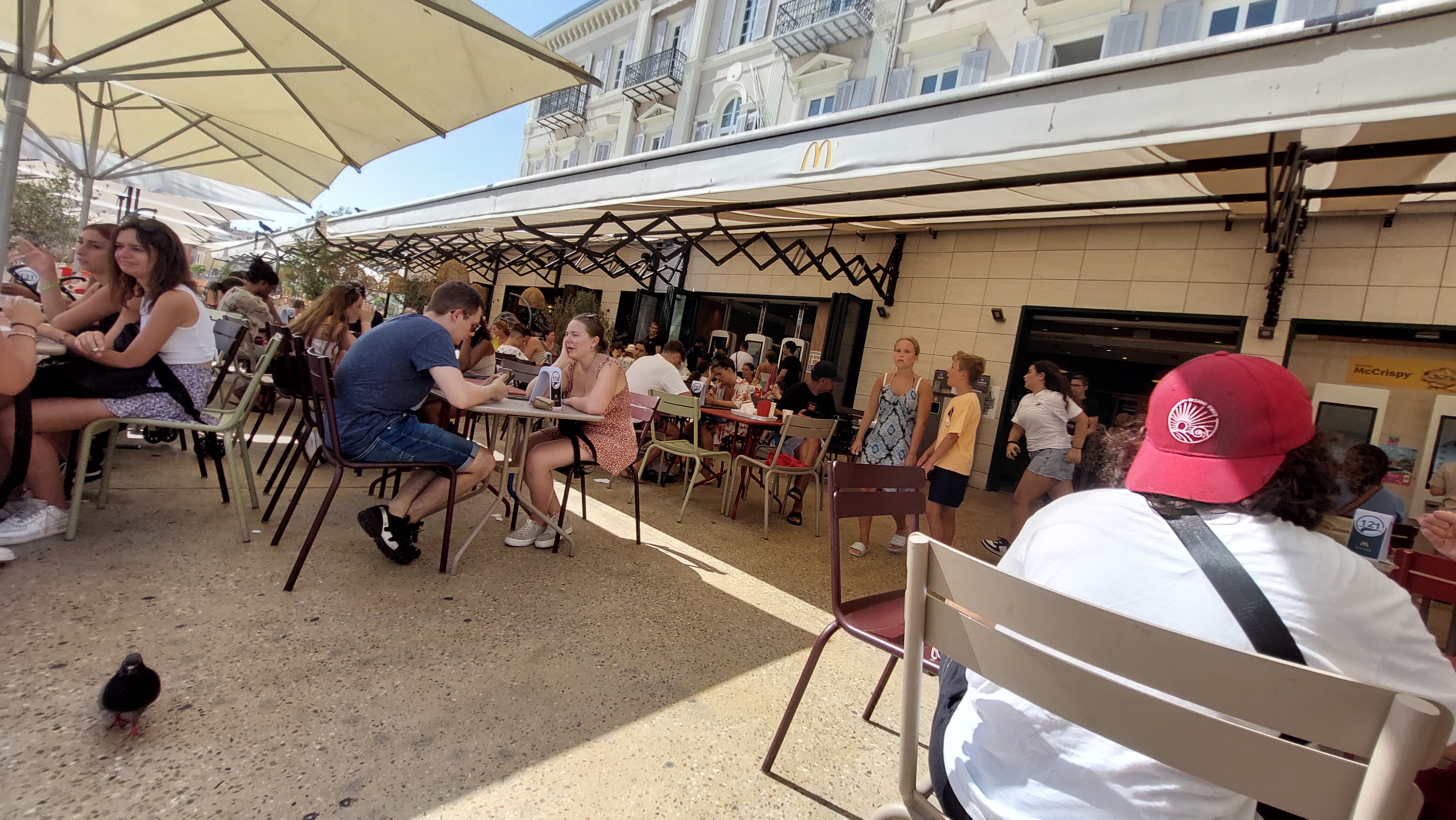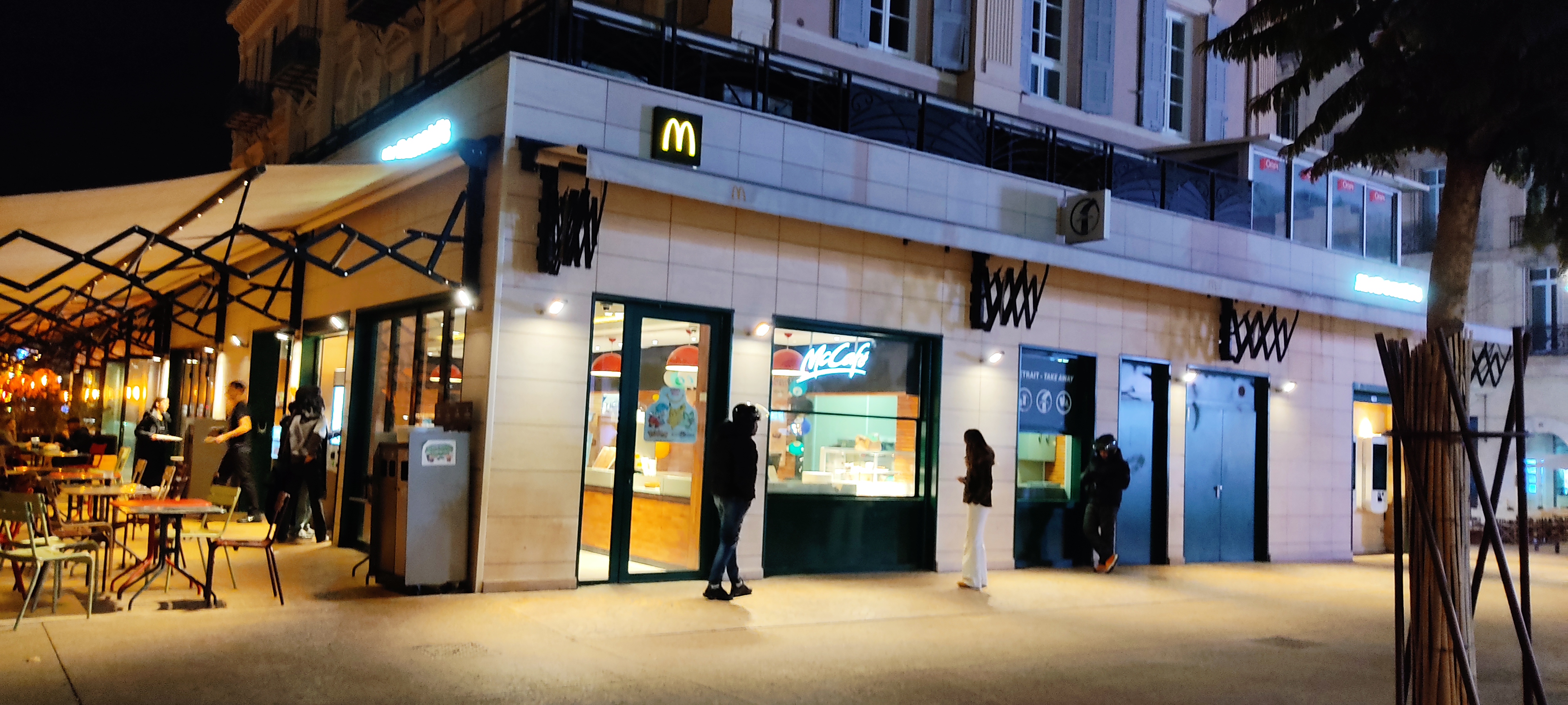 Nul ! Pas d'espace pour manger à l'intérieur. Malheureusement à cannes il ne fait pas beau 365 jours par an. Manger dans le froid et sous la pluie ... Je ne le recommande à personne. Les restaurants à côté on tous déployer leur parasol sauf le McDo ... A fuir a tout prix ... En travaux pendant un long moment pour ça ... Inutile... Horrible l'été, insupportable l'hiver ... Allez plutôt au restaurant à côté !
