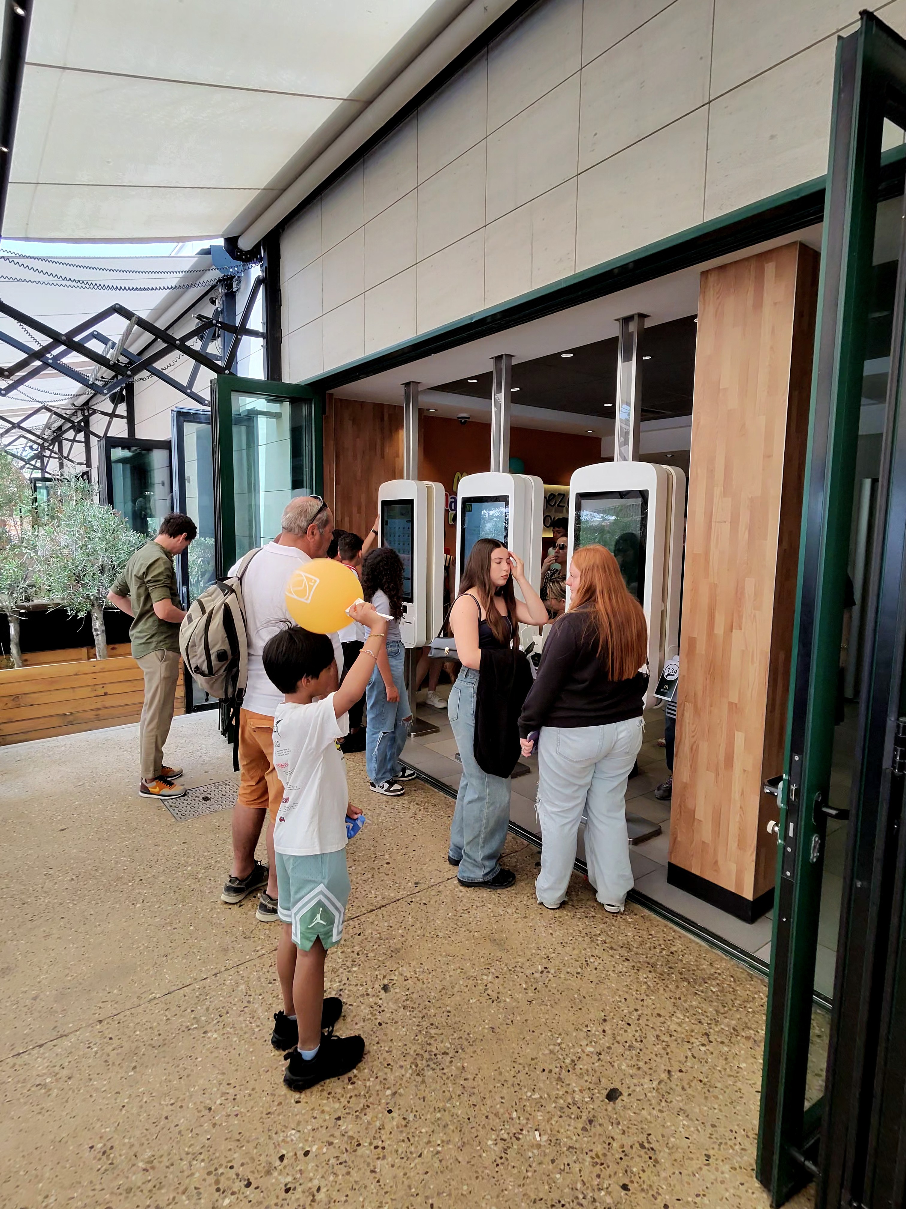 C'est très mal fait, le lieu est pris d'assaut par de nombreux clients ce qui est plutôt logique pour un McDonald's mais les bornes sont mises sur un flanc et sur la terrasse où tout le monde se marche dessus. Ensuite la zone de récupération des commandes est très mal organisée, on n'entend rien les vendeurs doivent crier toute la journée alors que franchement... un simple écran indiquant le numéro de la commande prête réglerait ces problèmes ! Le McDonald's en lui même n'est pas terrible, et les employés peu souriants mais ça je le comprends car ça ne doit pas être de tous repos de gérer un tel afflux. L'établissement devrait revoir ses méthodes de gestion, aussi bien pour les clients que ses employés. C'est dommage !