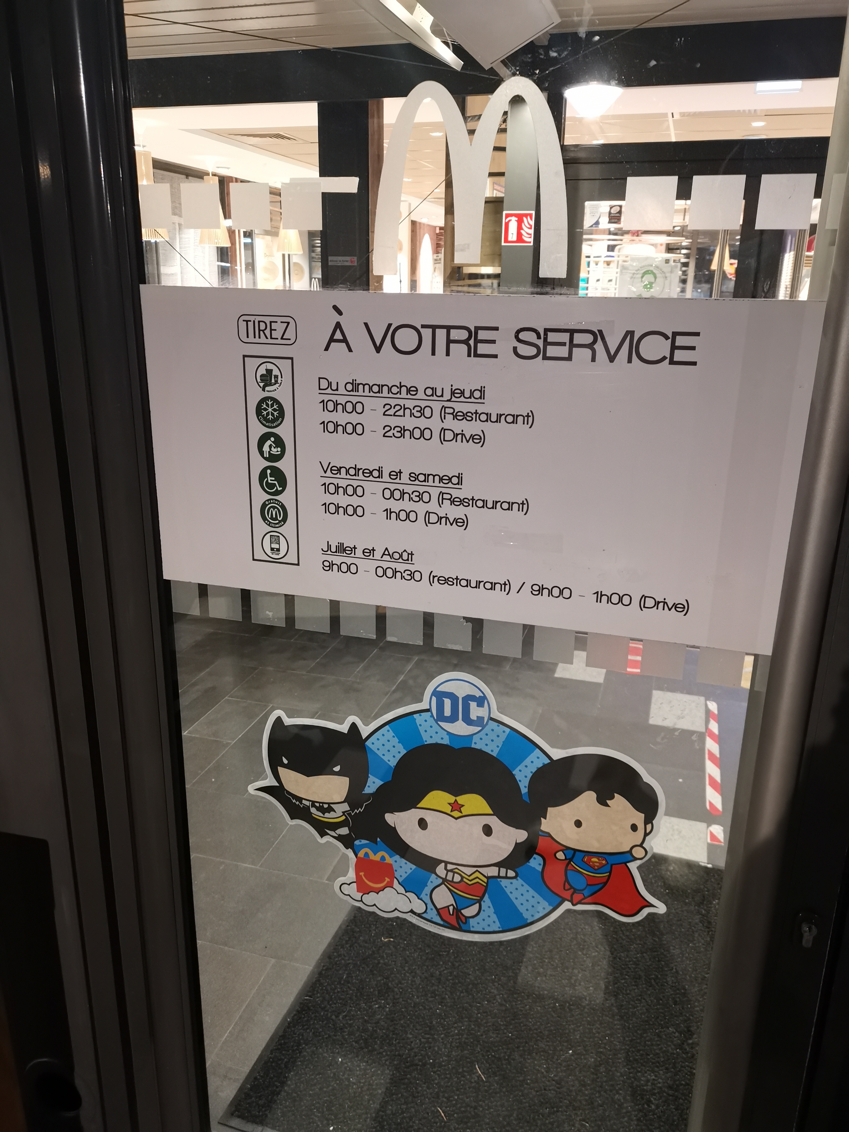 Un McDo ouvert normalement jusqu'à 23h, mais en fait fermé a 22h58. Sinon l'équipier finit trop tard apparemment!!! Je suis très déçu de ce discours. 23h c'est 23h pas 22h58... Passez votre chemin à côté d'autres font mieux