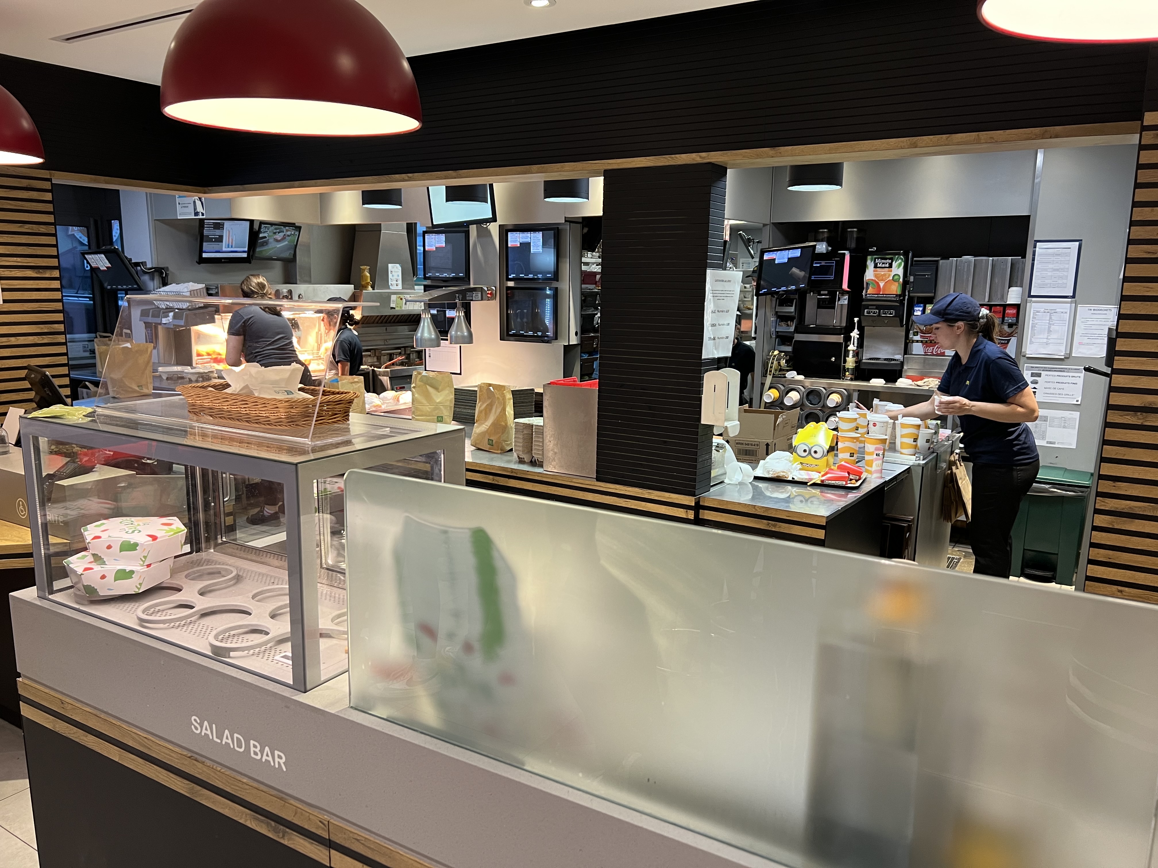 Lieu calme où il est agréable de manger. Aucun bruit parasite c'est vraiment plaisant (friteuse, bornes ou cris provenant de la cuisine) Lieu propre, l'équipe est vraiment proactive après le départ des clients les tables sont nettoyées prêtes accueillir de nouveaux clients. L'équipe est sympathique et souriante. Avenante envers les clients qui attendent au comptoir pour les encaissements ou les desserts remis plus tard.