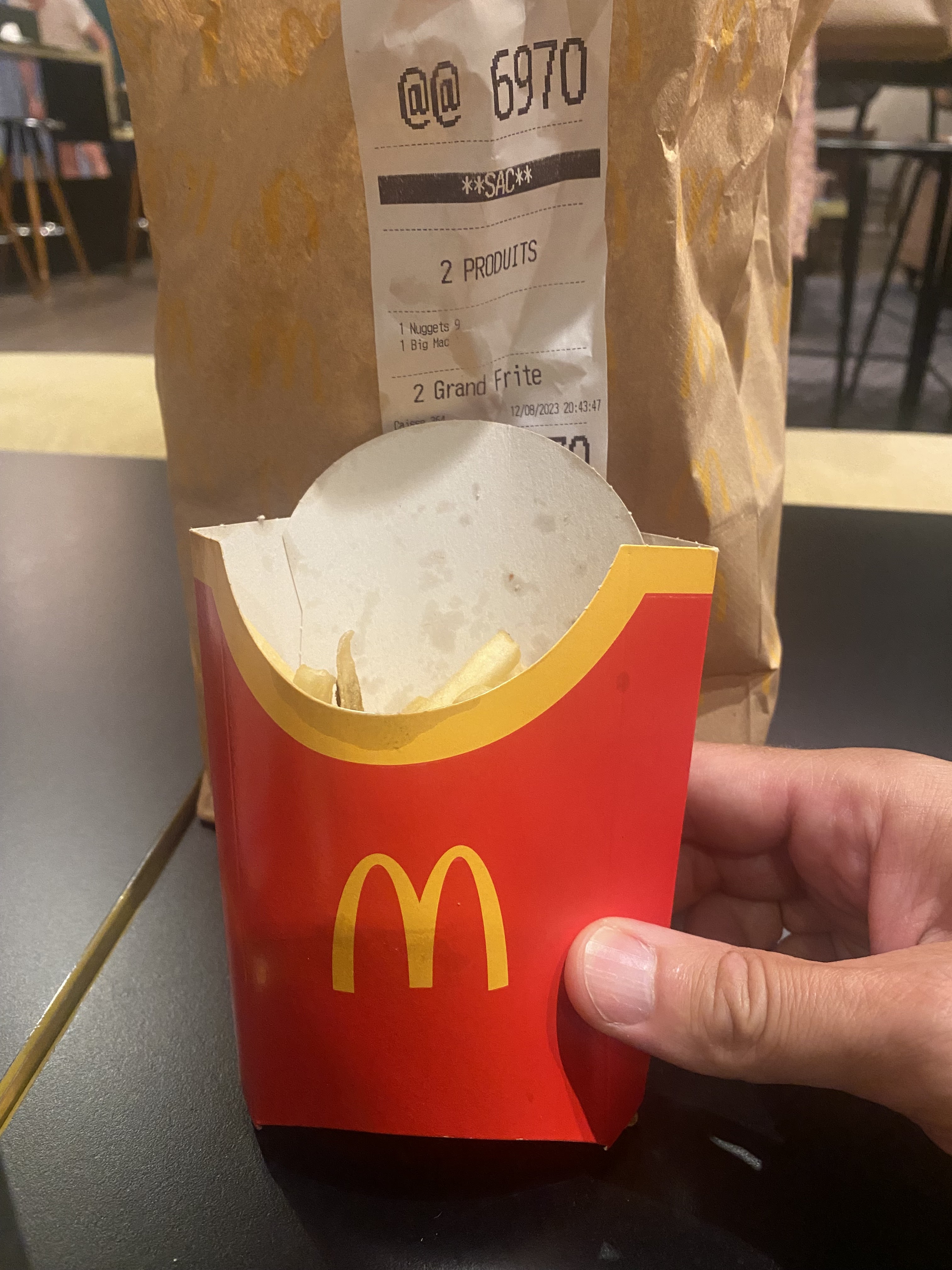 17h45 , un petit creux et je passe devant le au mac do et je ´arrête m’acheter une petite frite! Frites que je récupère au drive quasi froide et surtout absolument pas bonne. A croire qu’on a réchauffé les restes! Une honte.