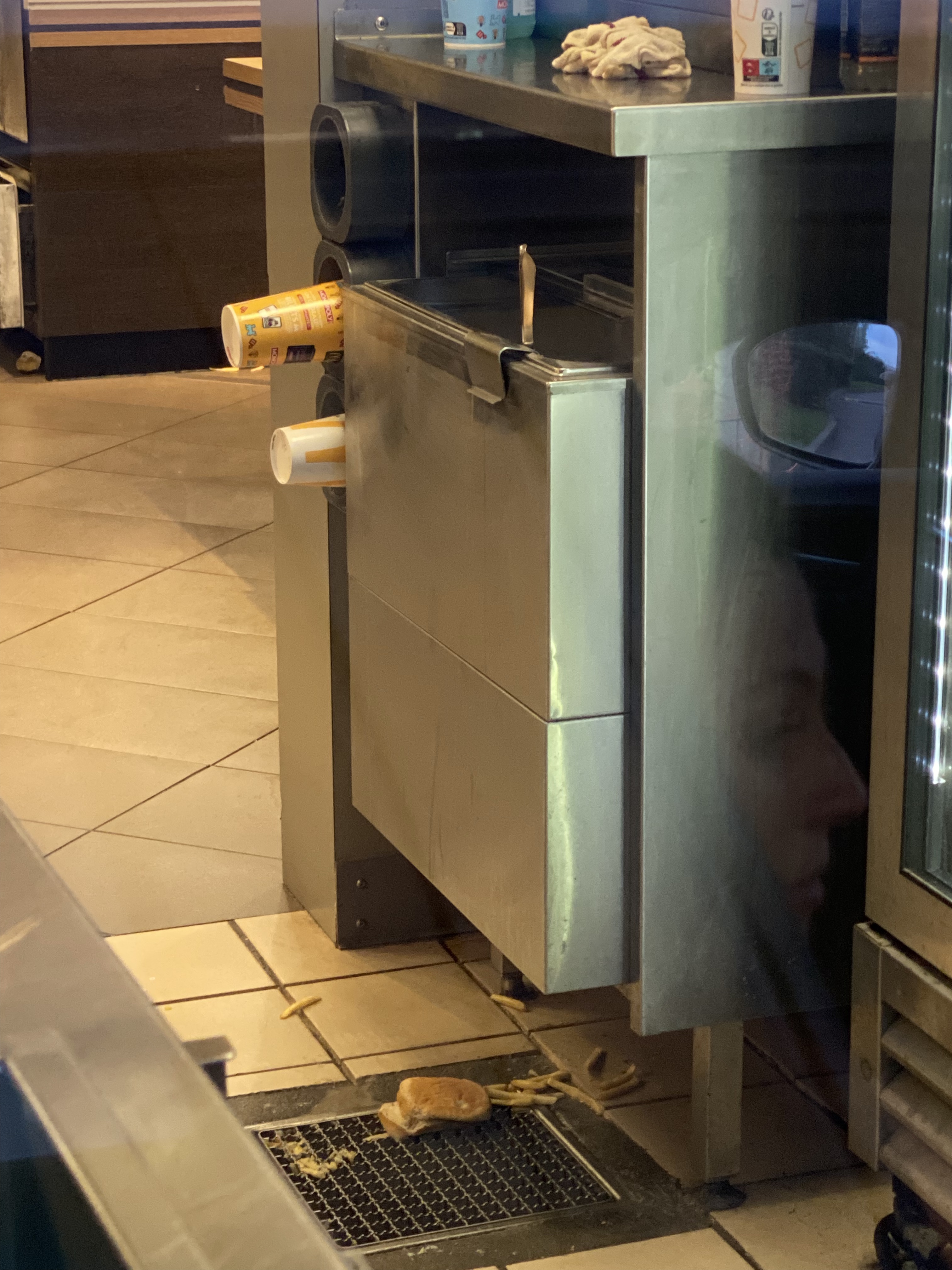 Mac do plutôt petit Du coup beaucoup de problèmes d'hygiène De plus avec le service en salle, les aller retour entre la salle et les cuisines apportent plein de graisse d'huile partout. Ca faisait 5 ans que j'avais pas mis les 👣 dans un mac do. 10 euros y a rien a manger. Une fois sorti je suis parti me faire un kebab qui m'as enfin calé.