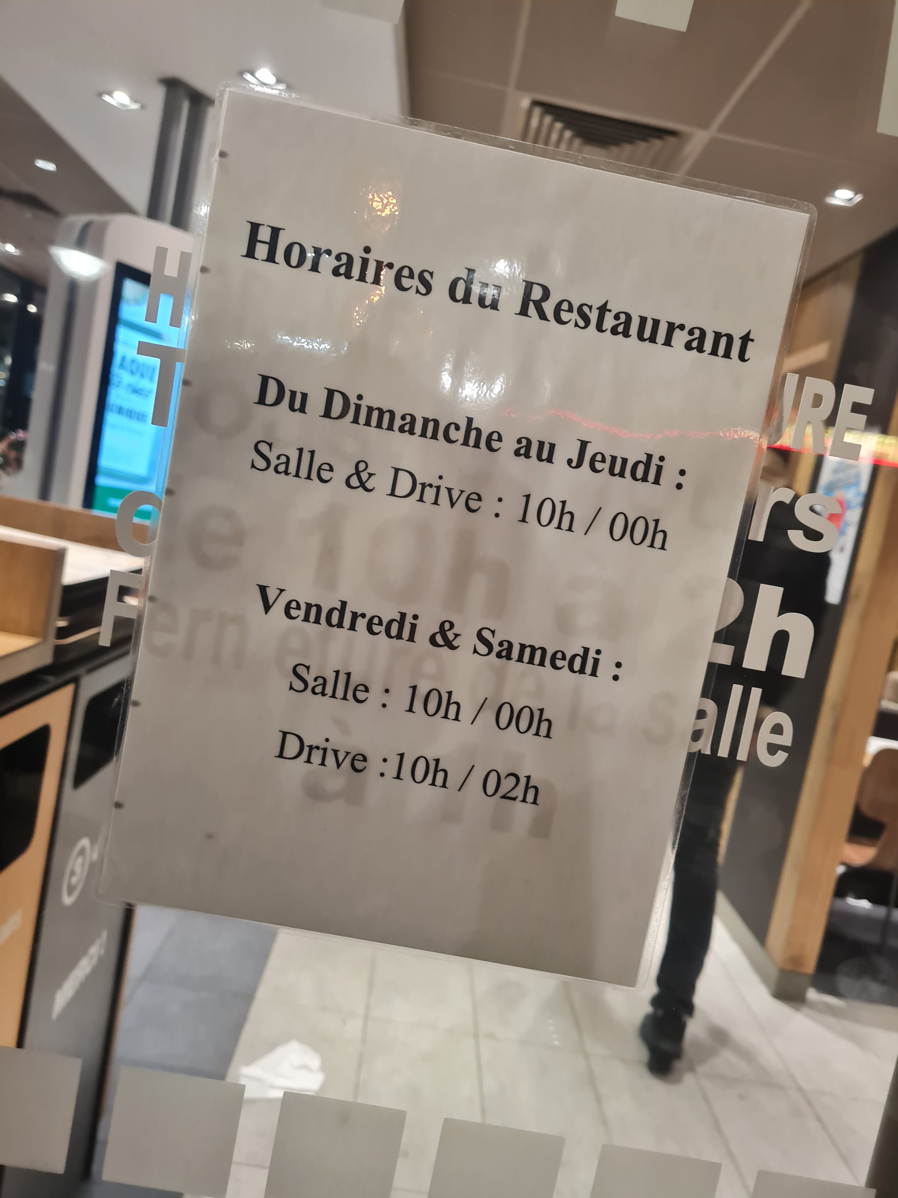 Retour de match (mercredi soir) Plusieurs véhicules (à leur près 5-6) dans le drive entre 00h20-1h. Borne toujours éclairer , employer du McDo à l’intérieur faisant le ménage de la salle… au bout de presque 30 min à attendre devant la borne , sans réponse. Les employés toujours à l’intérieur à aller venir dans le mcdo…. Un client sorti de son véhicule a 00h45 est aller jusqu’à la fenêtre demandant pourquoi cela était aussi long alors que le drive est écrit ouvert jusqu’à 1h du matin ? On lui as répondu : Nous sommes fermes depuis 00h. Donc depuis presque 45 minutes nous attendions dans le drive sans que aucun employés ne sortent juste pour informer les voitures qui attendent ou bien même mettre des plots afin d’éviter que plusieurs véhicules continuent la file !!!!!!!! Alors que eux nous voyaient de l’intérieur !!!!!! Mettez les bons horaires sur le site