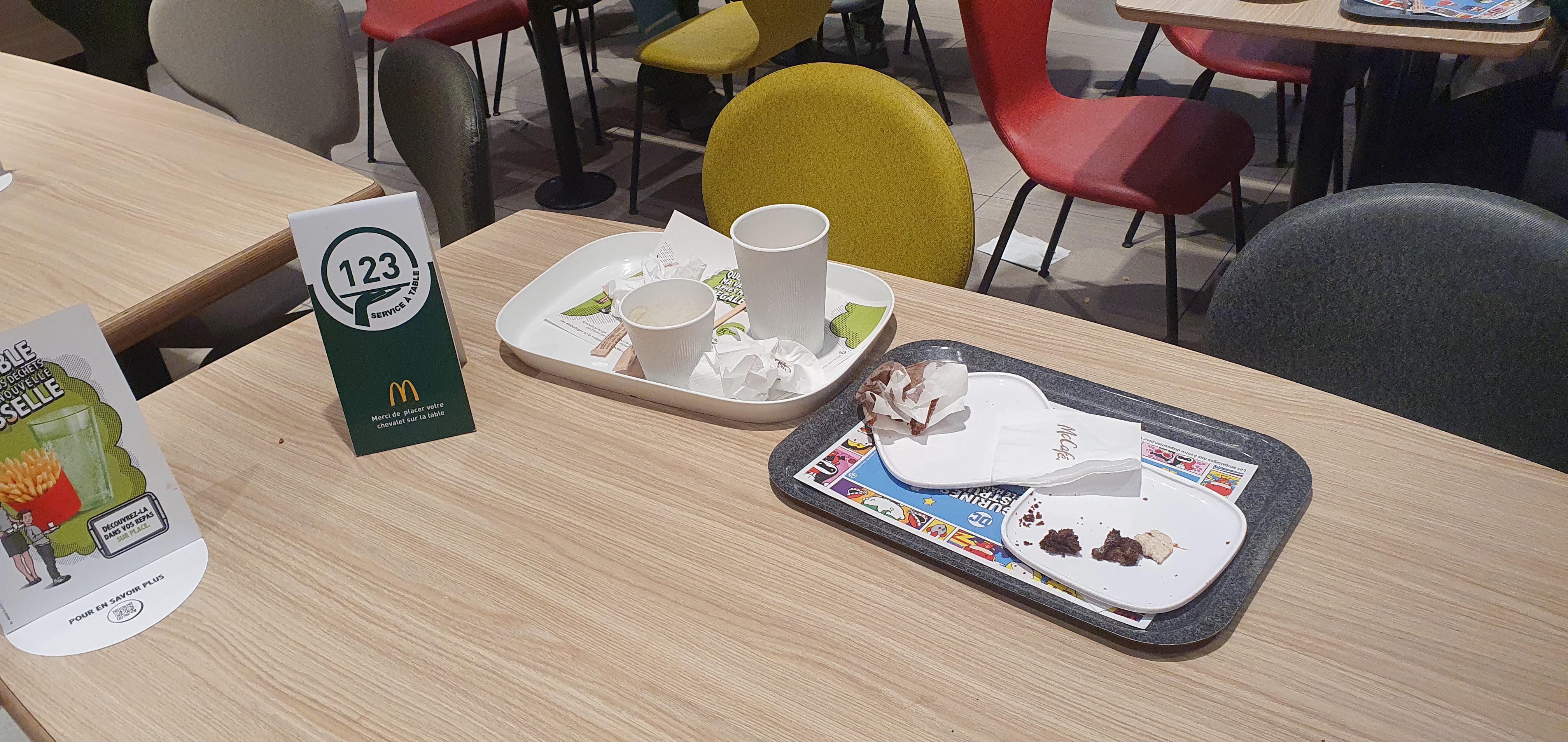Pas de chevalet c'est au client d'aller les récupérer de l'autre côté du fast food du coup attente interminable et ceci à chaque passage. Mauvaise organisation Pas de sucre pour le cafe. Endroit particulièrement sale photos à l'appui. Tables pas débarrassées, frites qui jonchent le sol. INADMISSIBLE POUR LA CLIENTE