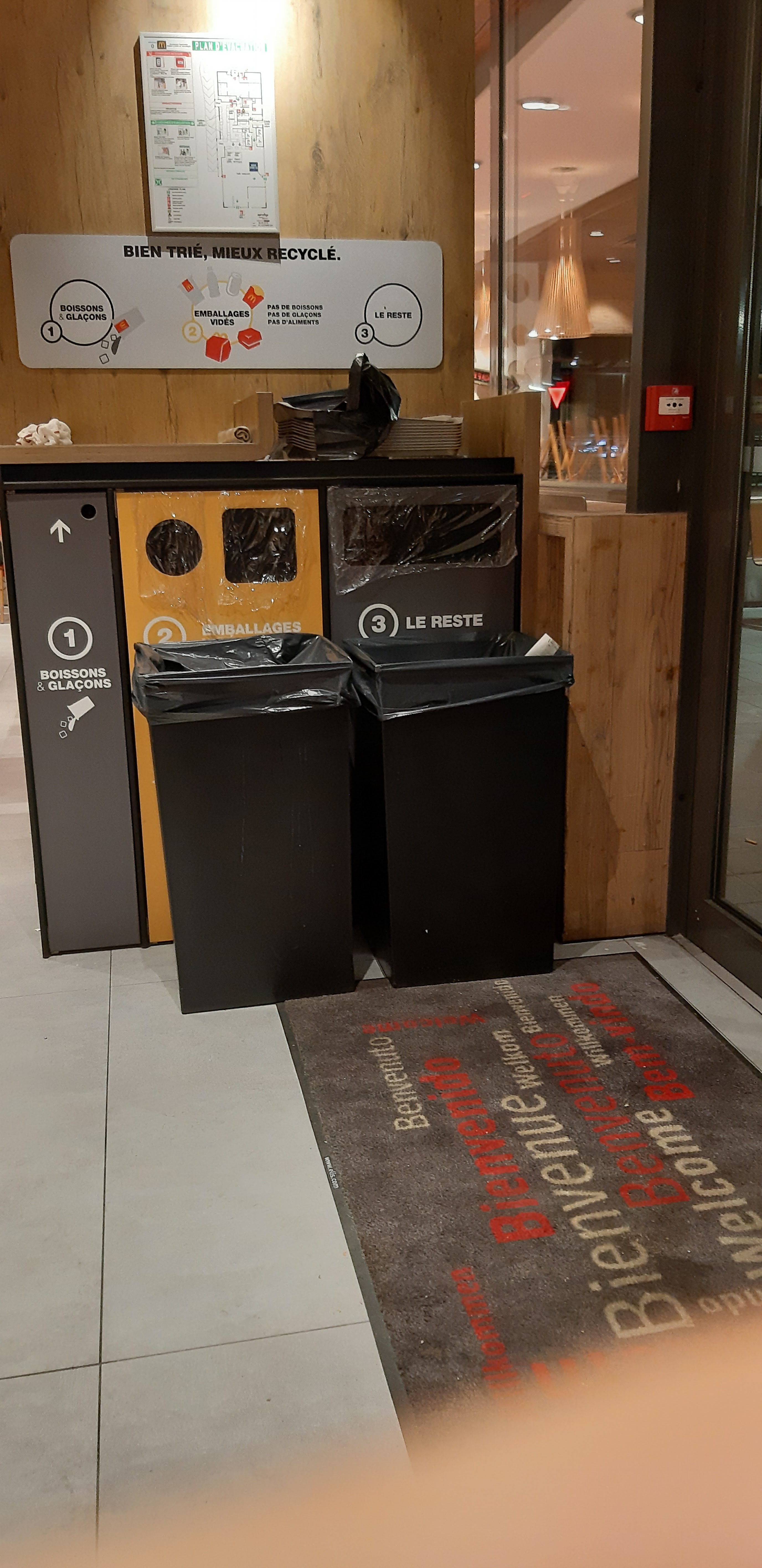 Je suis exaspérée de voir que mes emballages cartons arrivent dans la même poubelle que les détritus donc rien n'est recyclé. En plus les frites n'étaient pas assez cuites. Et pas de papier dans les toilettes en début de service.