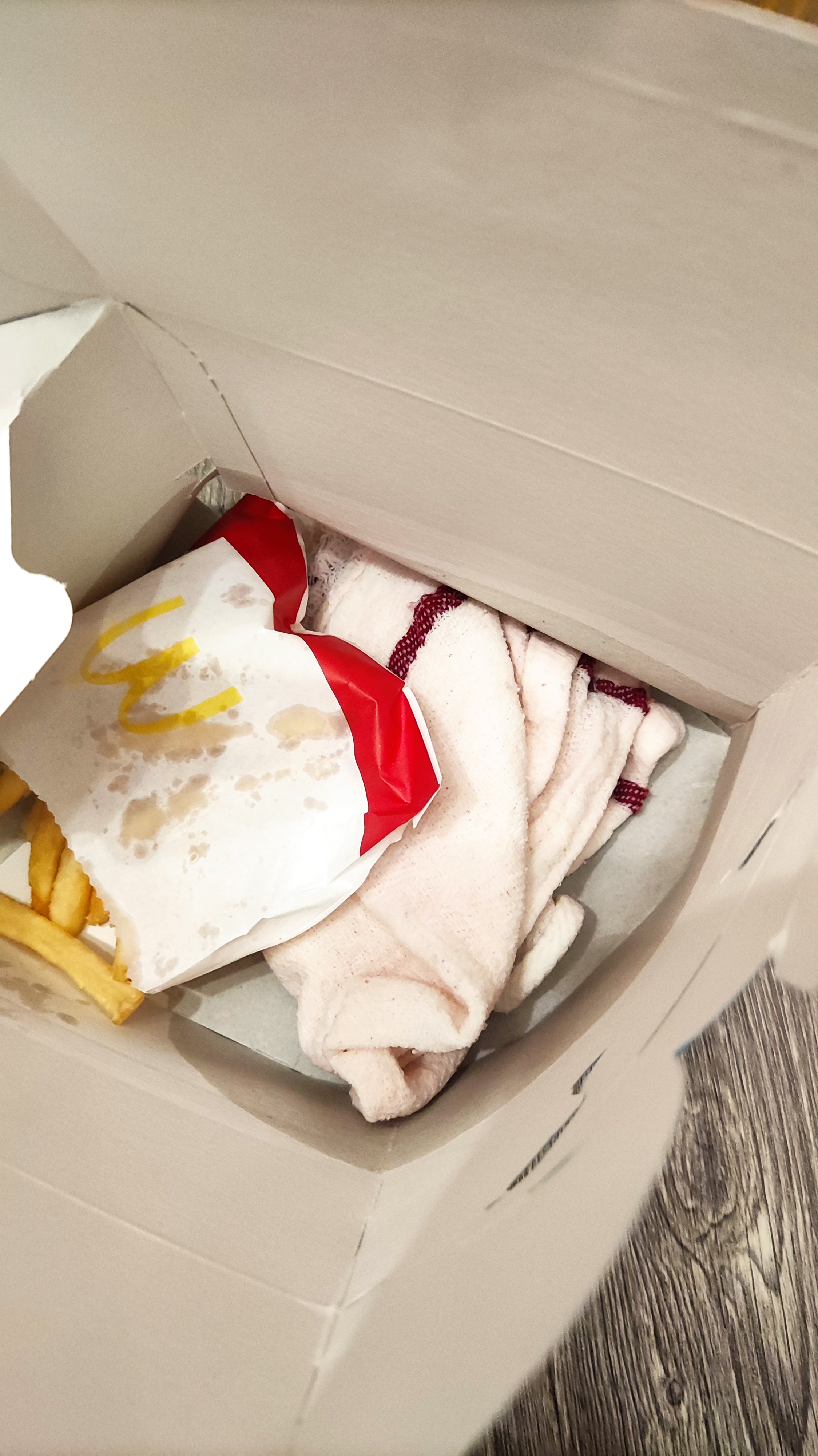 Venu aujourd'hui au drive et quelle horreur nous avons trouvé une chiffonnette toute mouillée au fond de la boîte happy meal au milieu des frites et des nuggets ! Plus jamais je ne remettrais les pieds chez vous ! Vous avez de la chance que je n'appelle pas les services sanitaires !