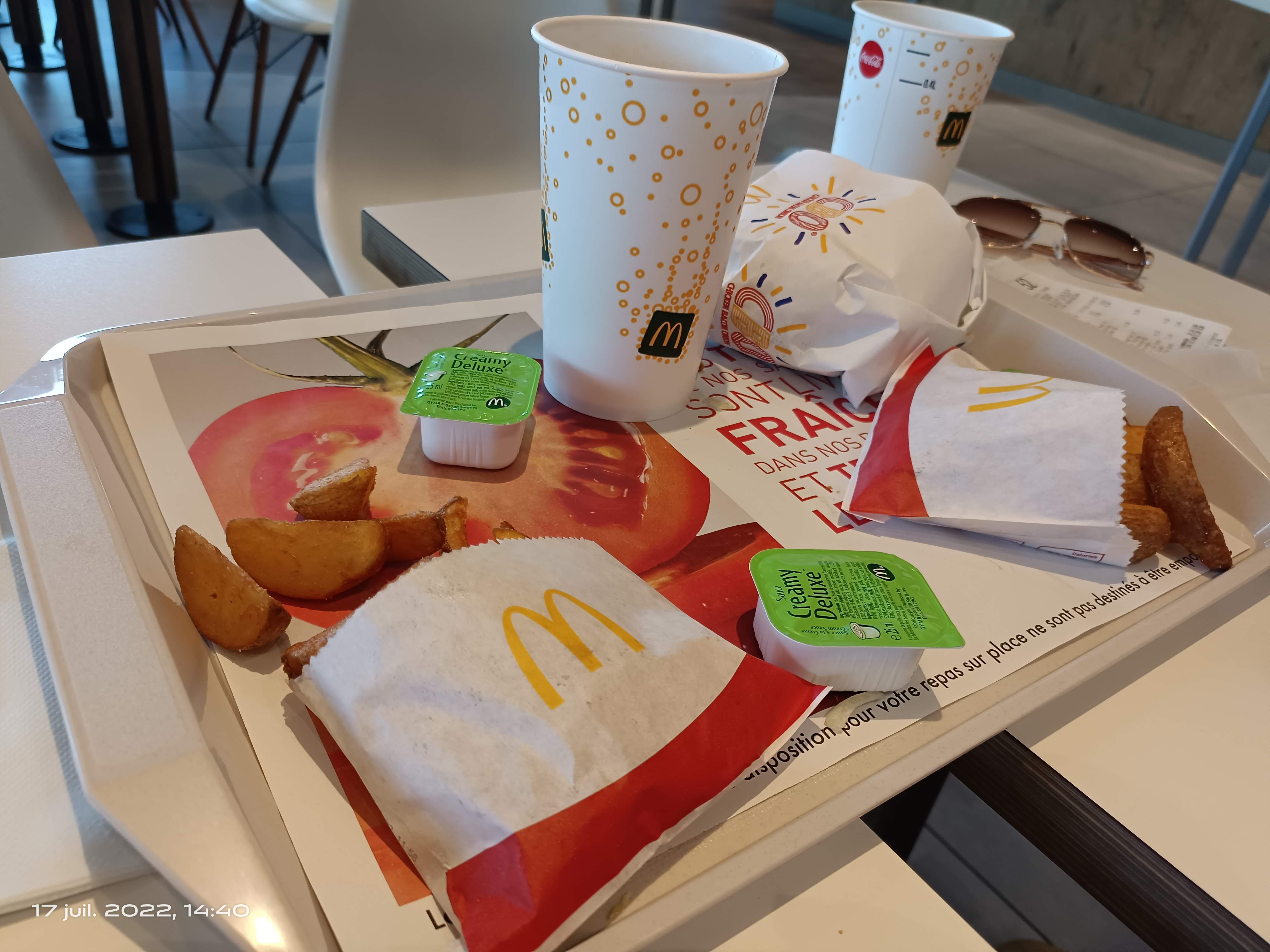 Cela faisait longtemps que je n’étais plus allé chez Macdo. Eh bien je crois que je n’y retournerai pas de si tôt !! Je prends un menu best of comme avant l’inflation galopante que nous connaissons de nos jours. Alors tout a diminué… sauf les prix qui ont fortement augmenté ! Les burgers qui existent depuis longtemps ont subi un régime très efficace ( il faudrait que je leur demande comment ils font, ça pourrait me servir) , les portions de potatoes sont idéales pour un menu enfant et pendant ce temps là, les prix se sont envolés. Je ne vous parle même pas de la taille de la salade de mon épouse, un scandale ! Si cette chaîne de fast-food trouve toujours sa clientèle, c’est tant mieux pour eux, mais ce sera sans moi, la concurrence fait bien mieux !