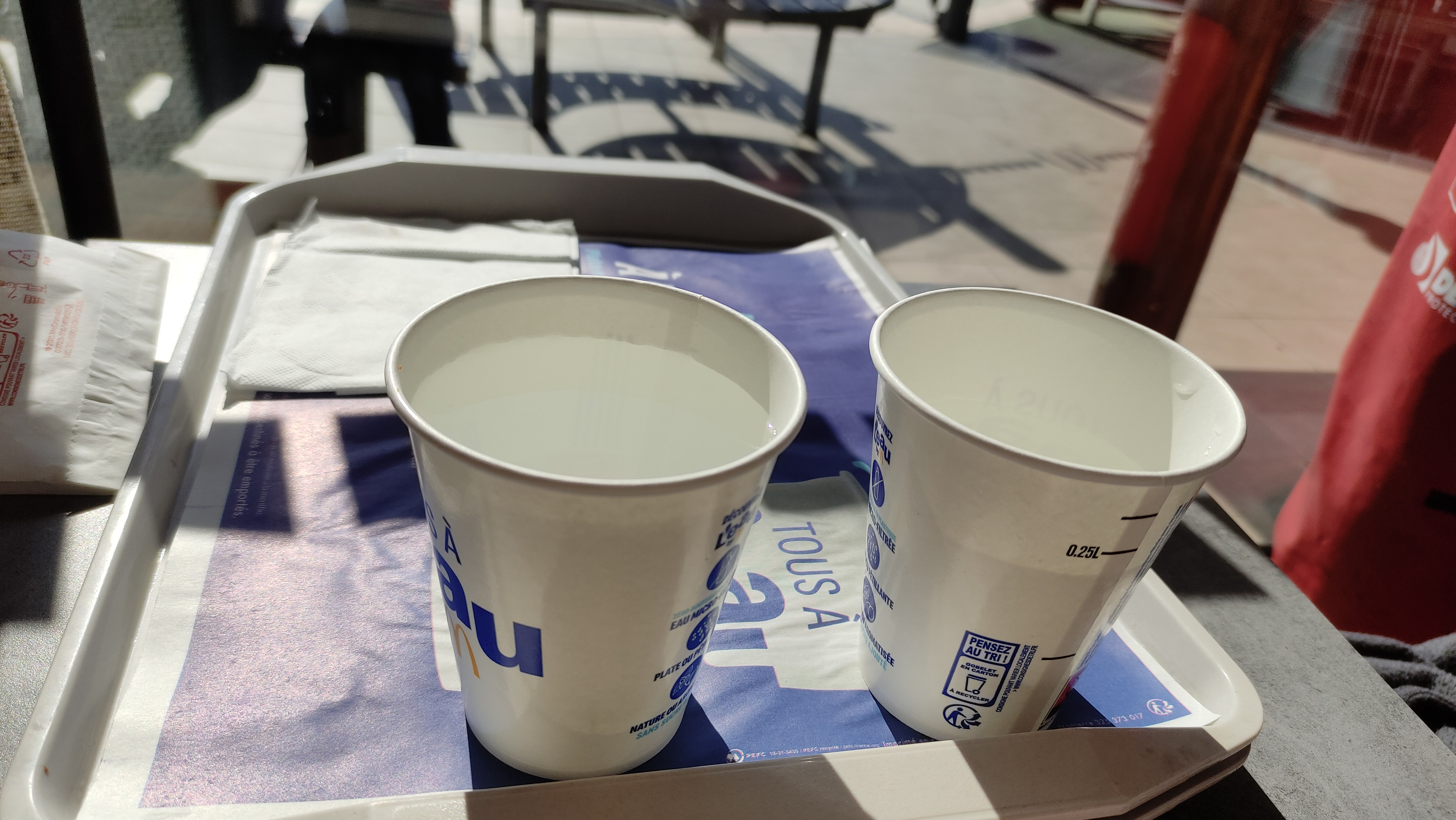 J y est mangé sur place samedi dernier avec mon pti neveu...la table était pleine de ketchup ...j ai demandé gentiment a un jeune homme du resto de mettre un pti coup de serviette...il est arrivé avec un Patou imbibé d eau ,a inondé la table avec et tout simplement répartis a ses tâches....je me suis rendu au toilette pour prendre des essuis tout pour éponger avant que nos plateaux arrivent ....pas cool du tout pour cette fois ...