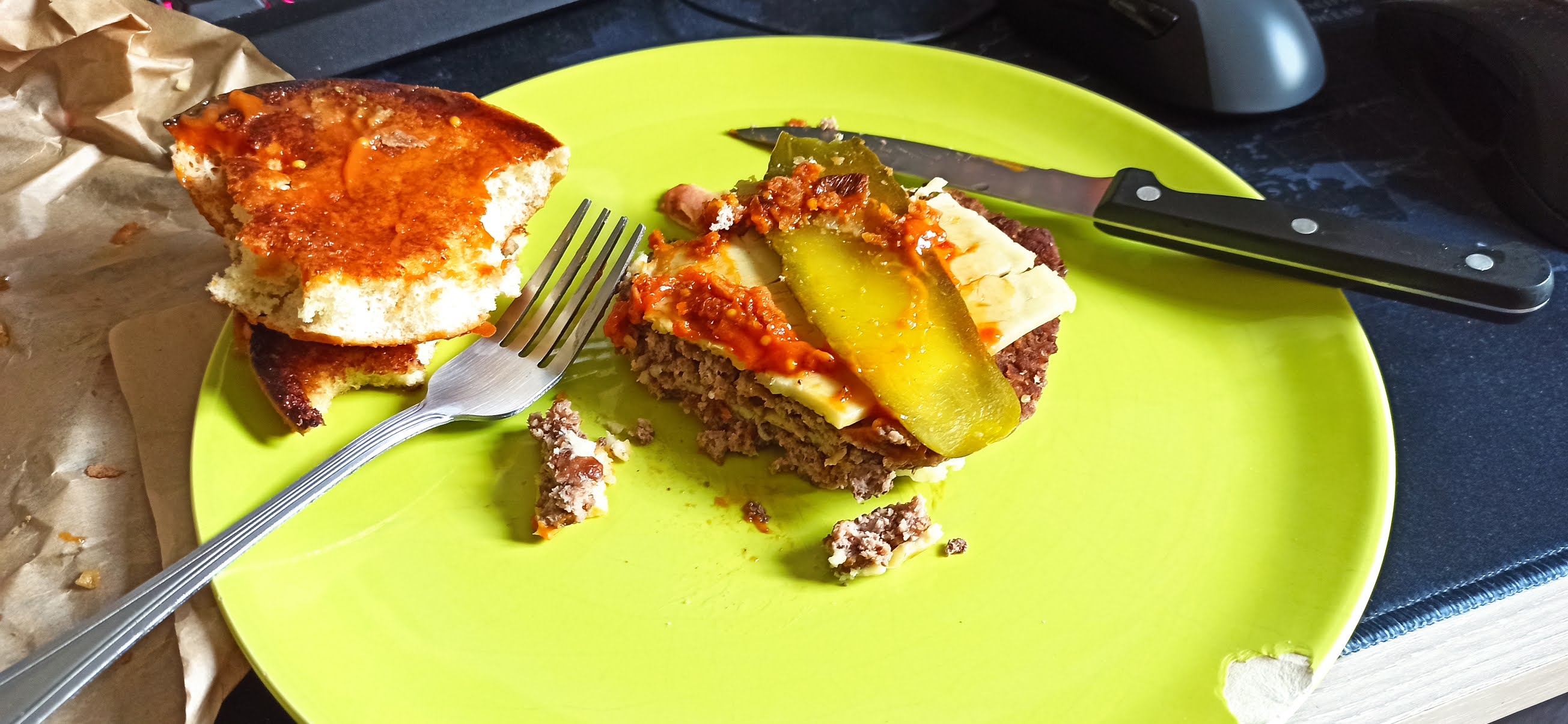 Verre mal lavé gras Le pain du dessus hamburger était froid