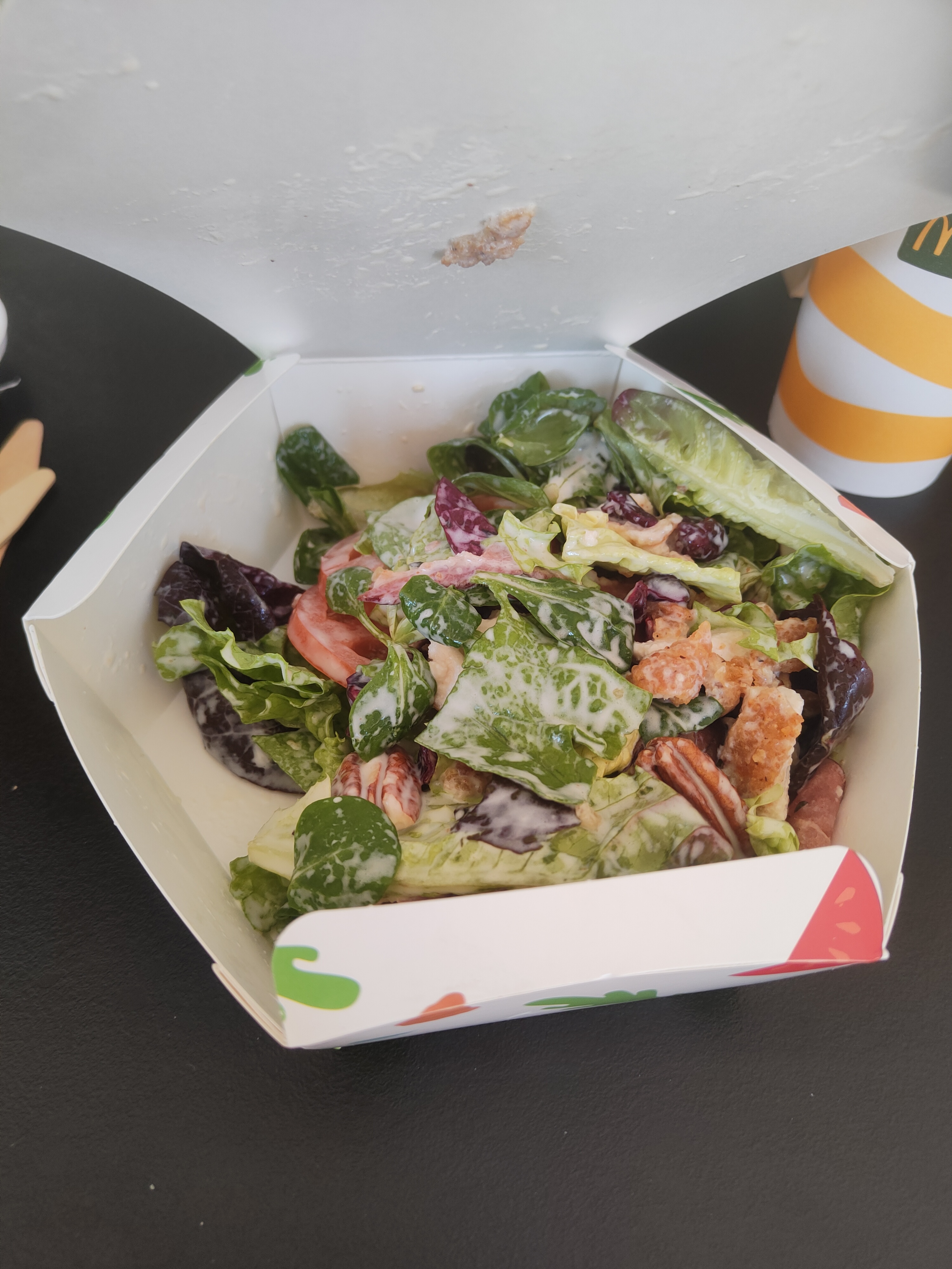 Entre les oublis de d'habitude, les produits non en stock, les produits pas chauds. Maintenant les mac Fleury qui n'ont pas la même dose, plus de 10 min pour faire une salade qui n'est pas présentable, sans gants, sans charlotte et sans masque. (On parle de nourriture là quand même) Et un manageur (ou même peut être directeur vu la tenu non protocolaire de la personne) qui veut coupé les commande de salade (et moi qui me demande pourquoi il n'y en a jamais dans ce restaurant) Je ne comprends pas pourquoi les choses ne changent pas depuis les commentaires tous tournés vers les mêmes problématiques. Heureusement que tous les restaurants ne sont pas comme celui là.. Édit voici la salade en dernière photo que j'attends réellement (mc do de Fenouillet)
