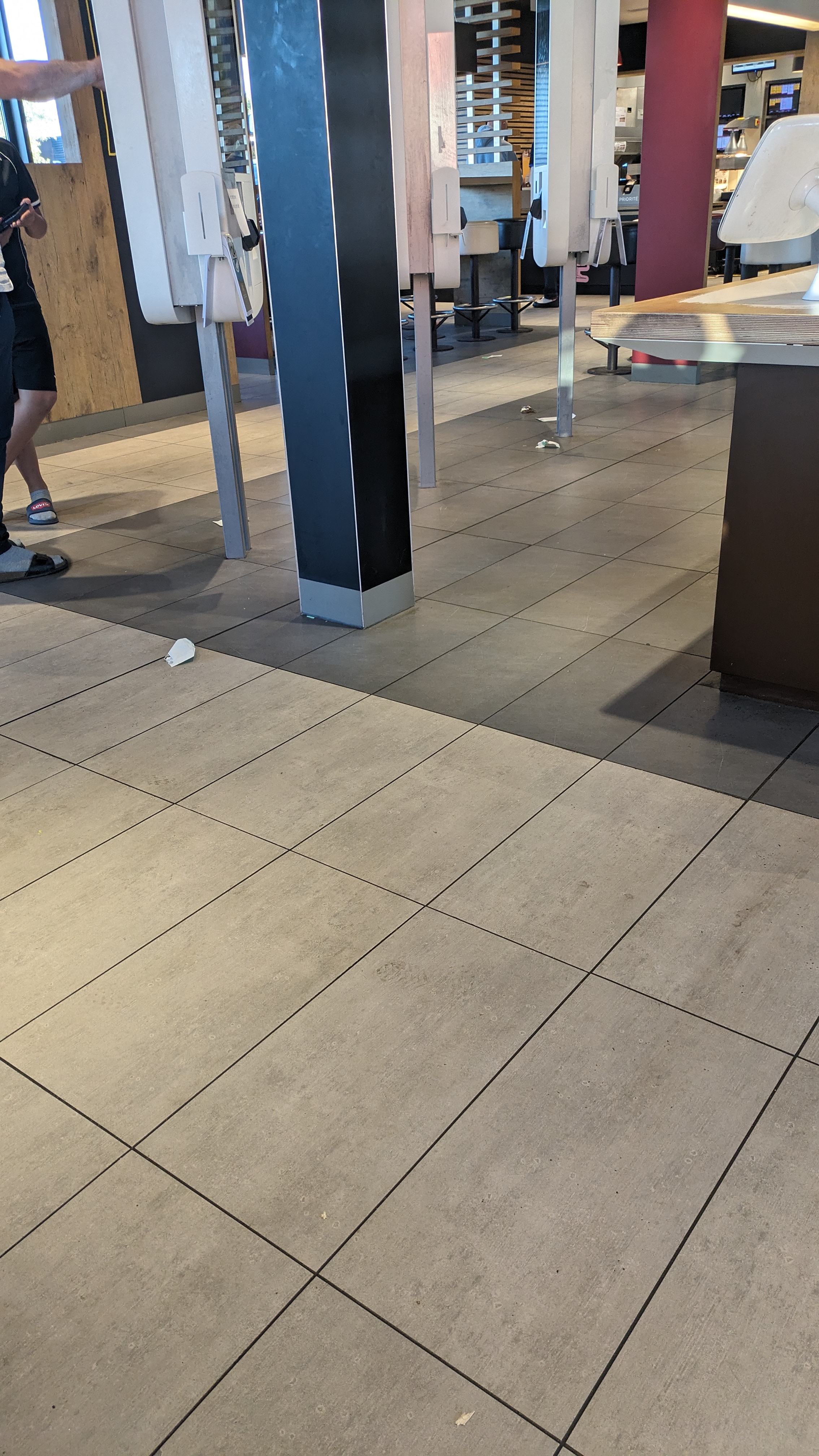 C'est ma première visite dans ce MC Do. Le jeune homme qui m'as servie était agréable même si j'ai eu un café normal à la place du déca, il n'a pas écouté ce que je lui ai dit (je suis allée au comptoir chercher ma commande exprès pour expliquer que sur la borne, le double déca n'est pas proposé, que j'en ai donc pris 2 simples à mettre dans le même gobelet...) Un homme était derrière le comptoir occupé à réparer quelque chose, il a levé la tête en me voyant, m'a dit bonjour mais n'a pas demandé à l'un de ses collègues de s'occuper de moi, heureusement que le jeune homme m'a vue sinon j'aurais attendu mon café un moment... J'ajoute que les toilettes étaient très sales et inondées et que les tables extérieures n'avaient pas été nettoyées...