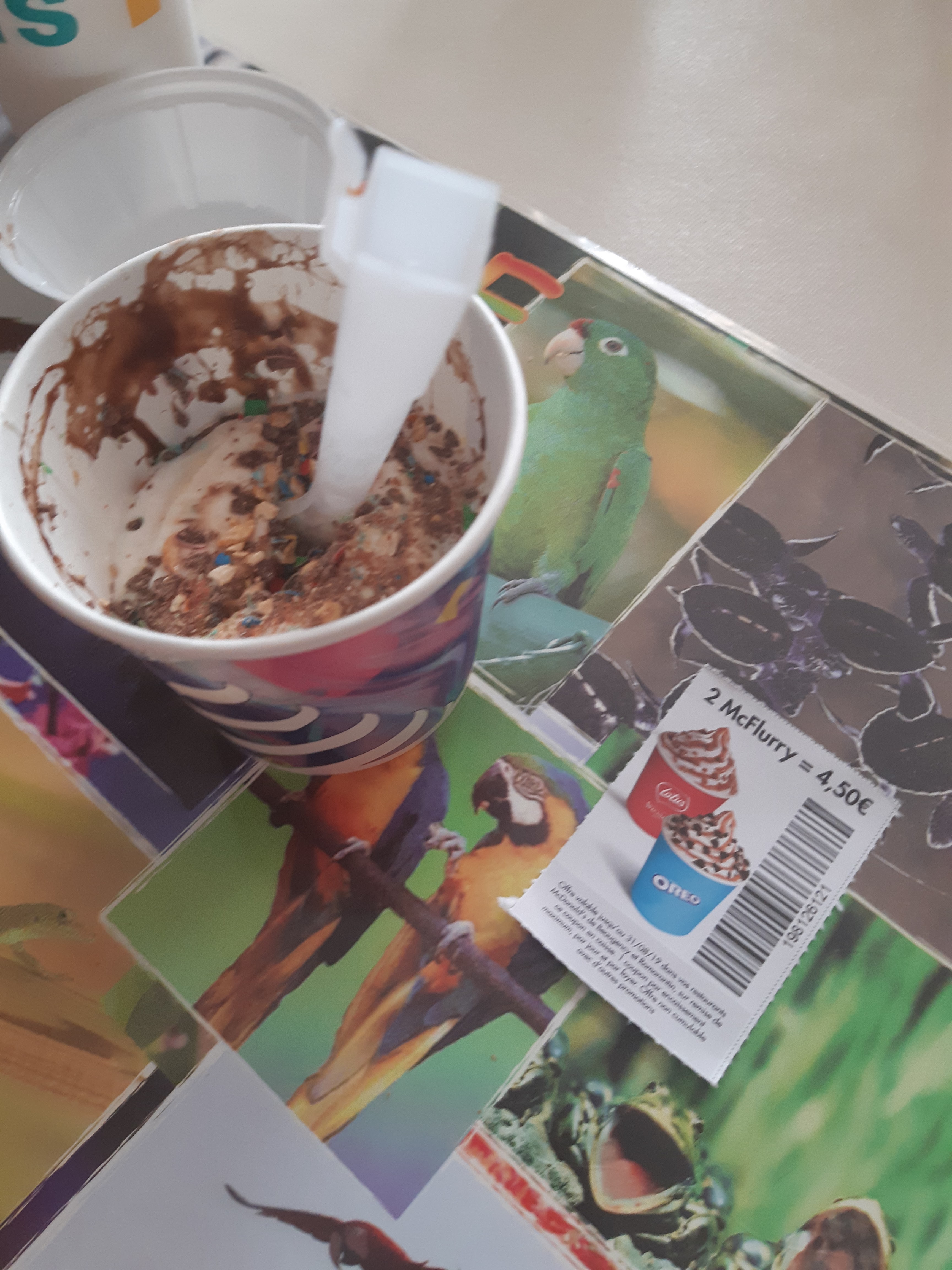 y allant pour chercher 2 glace qui sont quand même assez rapide à faire on me l'ai sert au bout de 20 min.. je prend un mc flurry oreo et nappage chocolat au final c'est plus une glace au chocolat que oreo et on paye ça 4,40€.