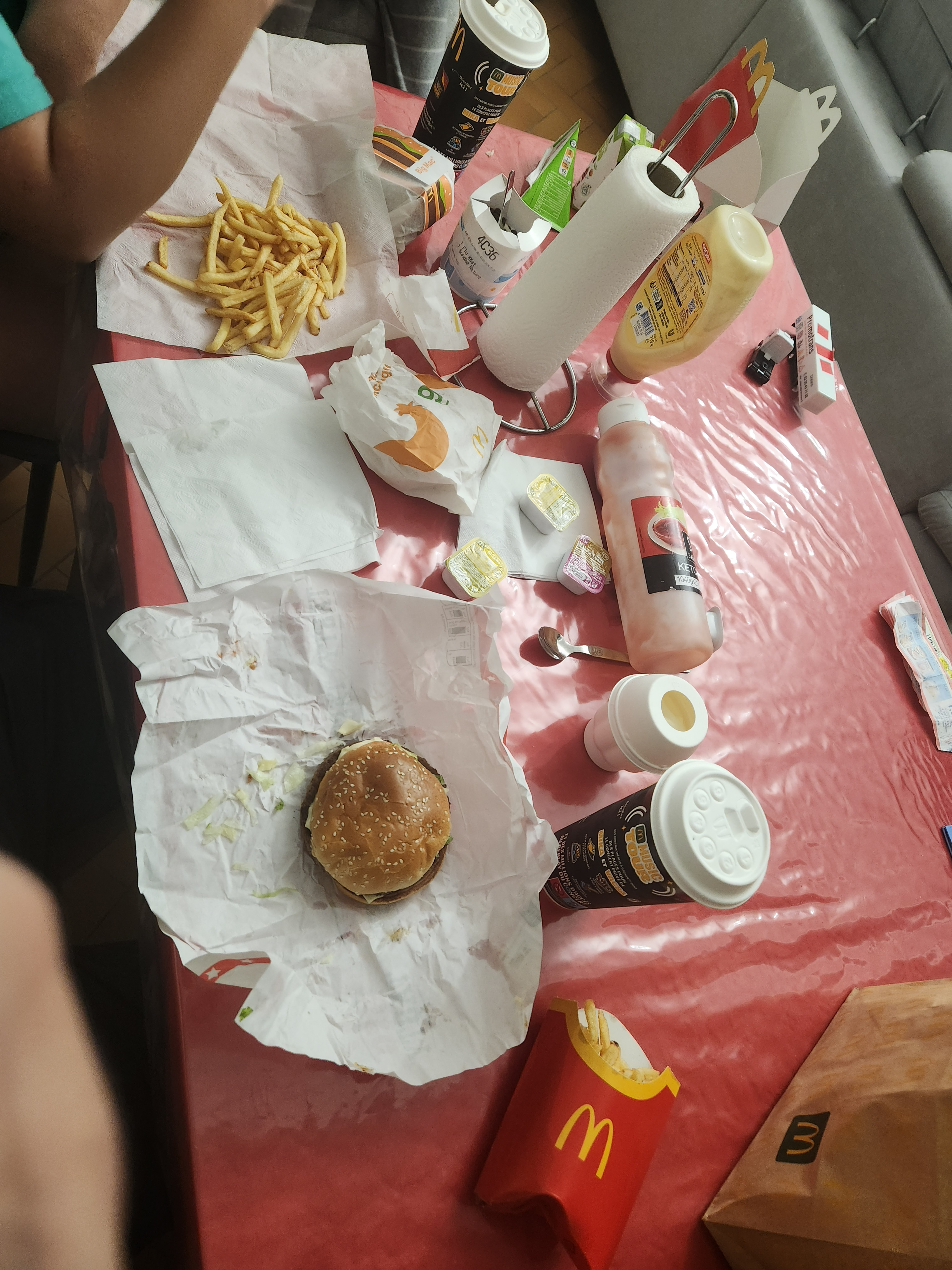Cela fait un moment que je n'avais pas mangé sur place dans un McDonald's, et encore plus un dimanche soir. Un monde fou, bien sûre. Le personnel est débordé, mais bienveillant. Beaucoup d'erreur dans les commandes tout autour de nous : - au drive, par manque d'article, le monsieur se plaint d'avoir du faire demi-tour ; - sur place, il manque une salade ; - sur place, une erreur de burger, mais il s'en rend compte après avoir mangé la moitié ; Et pour nous, nous sommes servis sans les boissons. Par conséquent, pensez à vérifier vos commandes et encore plus au Drive.