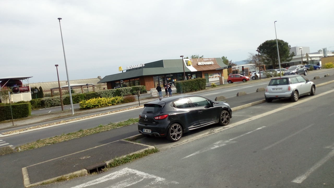 Le steack y a toujours un gout de carton les frites aussi. La mayonnaise n'a pas droit à ce nom, juste un sauce frites qui met en confiance... Passé ce constat un poil subjectif, reste que nous avons eu le malheur de déjeuner en terrasse : les véhicules entrant et sortant du drive-in nous enveloppent de leurs vapeurs de gasoil. Les bornes automatiques de commande nous demandent encore de travailler : McDonald's supprime des emplois et du service pourtant le prix ne baisse pas. Les toboggans mis à disposition ne sont pas adaptés aux enfants de moins de 6 ans.