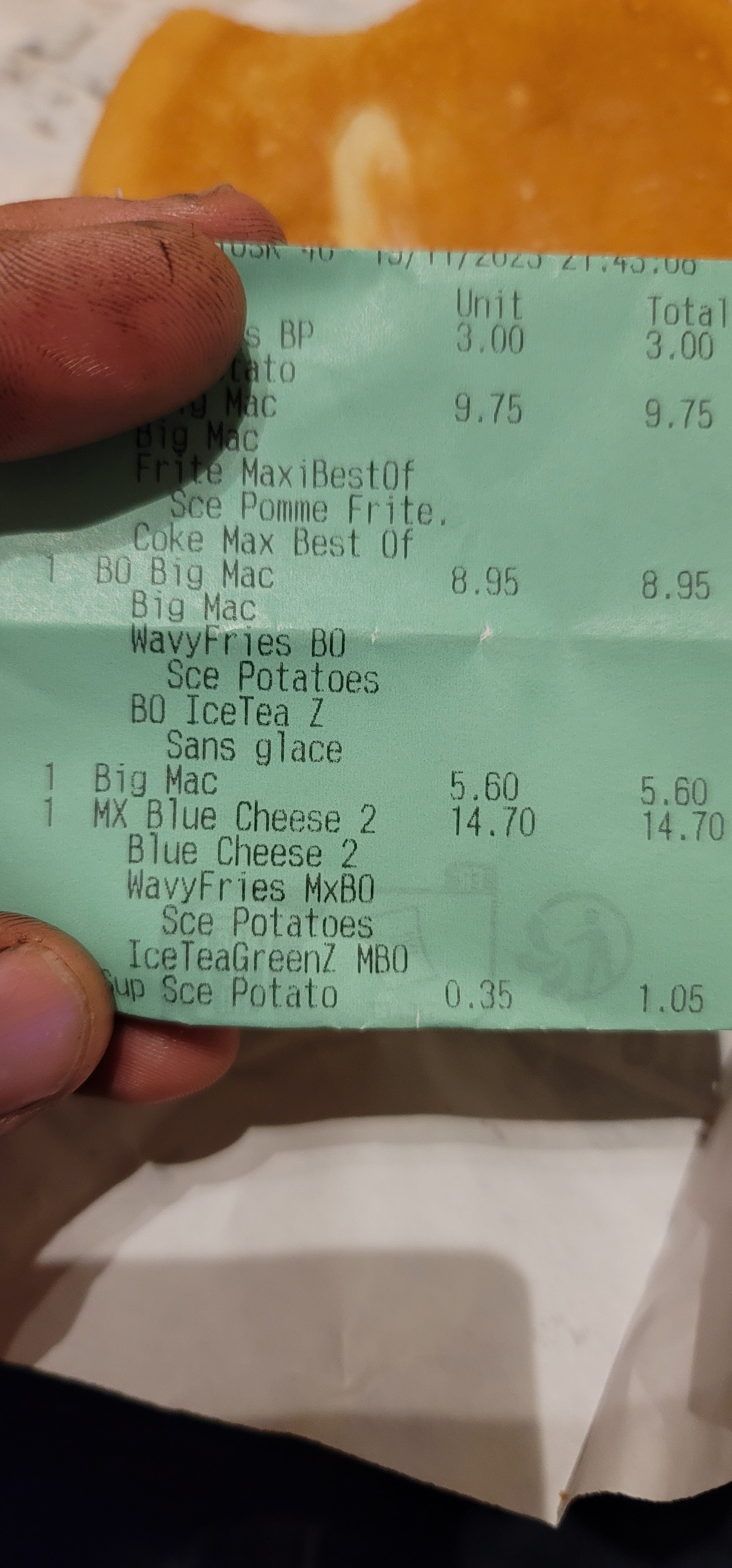 J'ai pris une commande en click and collecte quand j'ai ouvert les serviettes avaient étaient mises a l'arrache toutes froissées. Une grosse portion de potatoes 4-5 potatoes sur le dessus et en dessous... Des frites, j'ouvre bon Big Mac la salade dans le papier mais presque pas dans le sandwich, s'il vous plaît faites attention dans les commandes ne faites pas a l'arrache comme ça soyez professionnels ! Nous payons aussi pour le service