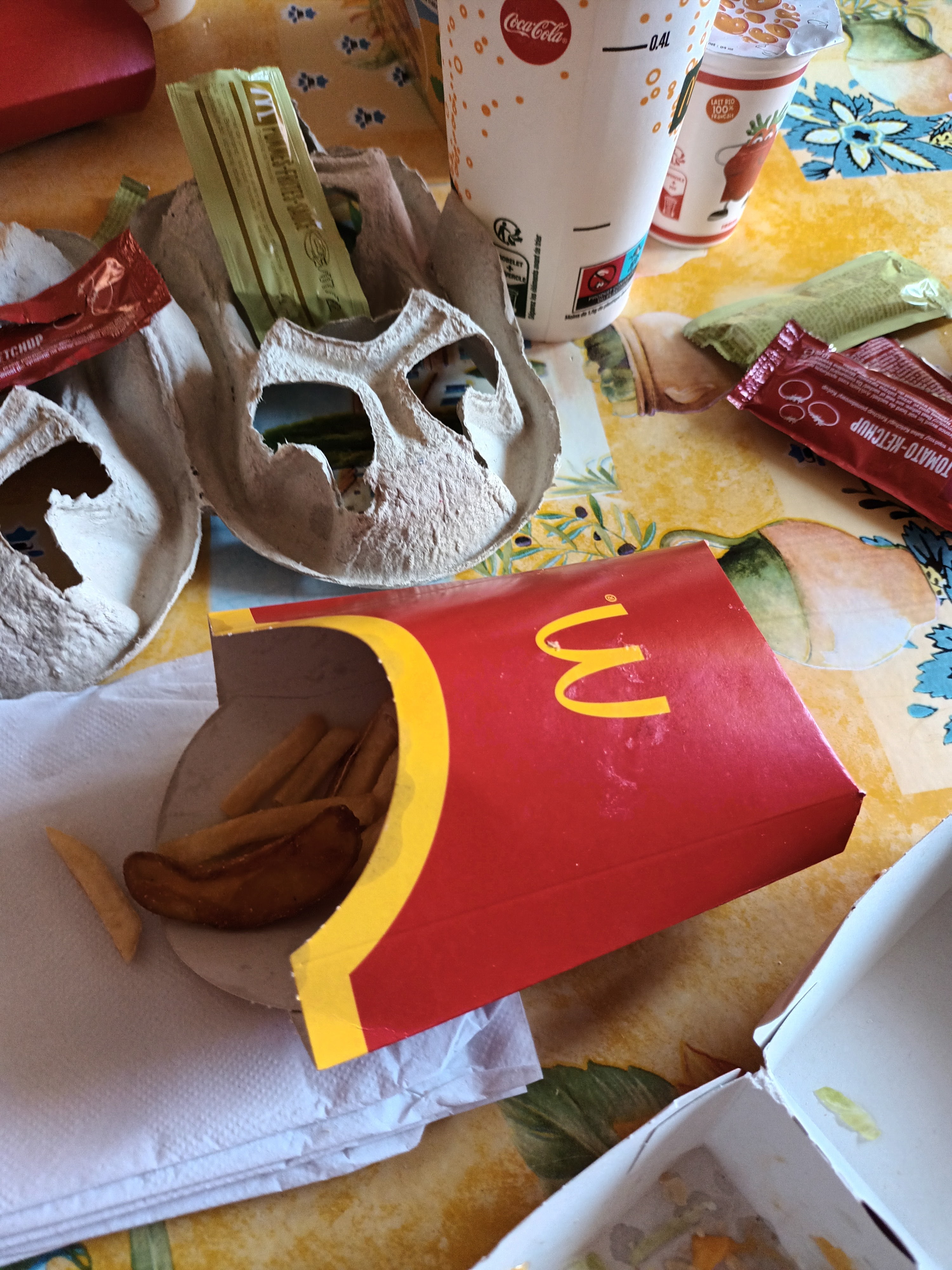 Franchement mc do ce n'est plus ce que c'était! Tout augmente et les portions diminuent 😡 quand je vois 4,70€ les frites cheddar et que ya 3 frites dedans franchement c'est abusé ! Le Big tasty qui augmente mais la taille du sandwich est plus petit on me répond oui mais c'est un steak de qualité des signatures 🙄 ouais ben on payait ce sandwich pour sa taille le goût du steak ne change pas au final ! Les glaces sont cher et remplies a moitié franchement c'est nous prendre pour des pigeons ! Je n'irai plus . J'ai la photo dommage que je n'arrive pas a la postée !!!