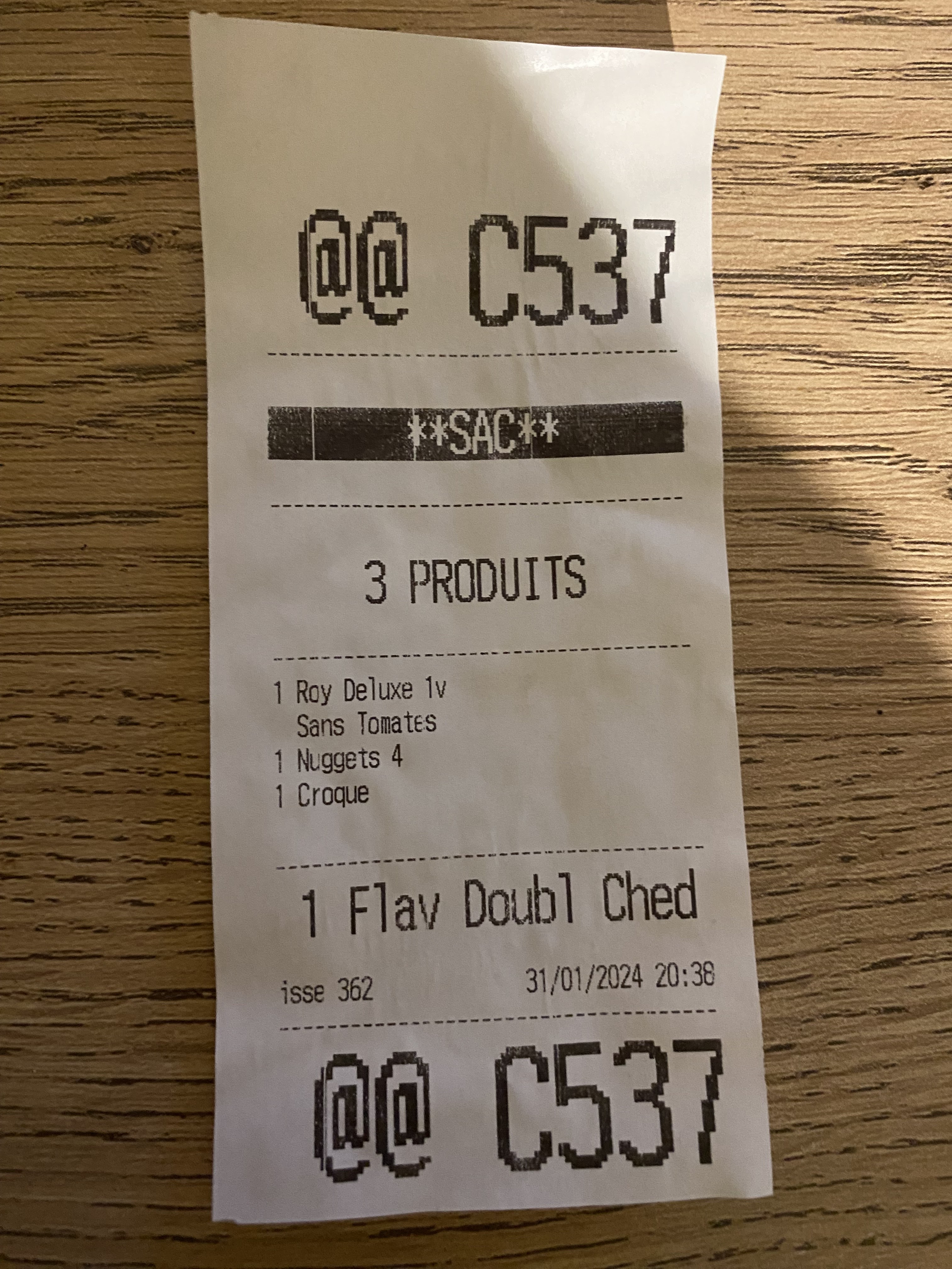 Ce soir 31/01/24 a 20h30 commande à emporter. Très déçu frites avec cheddar tranches posées et sûrement fondues au micro-ondes du coup frites molles et très amères, franchement infectes.Pas de couvert. Boisson non fermée qui c’est reversée dans le sac. Très déçu. Je n’ai pas fait de photo dommage du coup je joins mon ticket de caisse