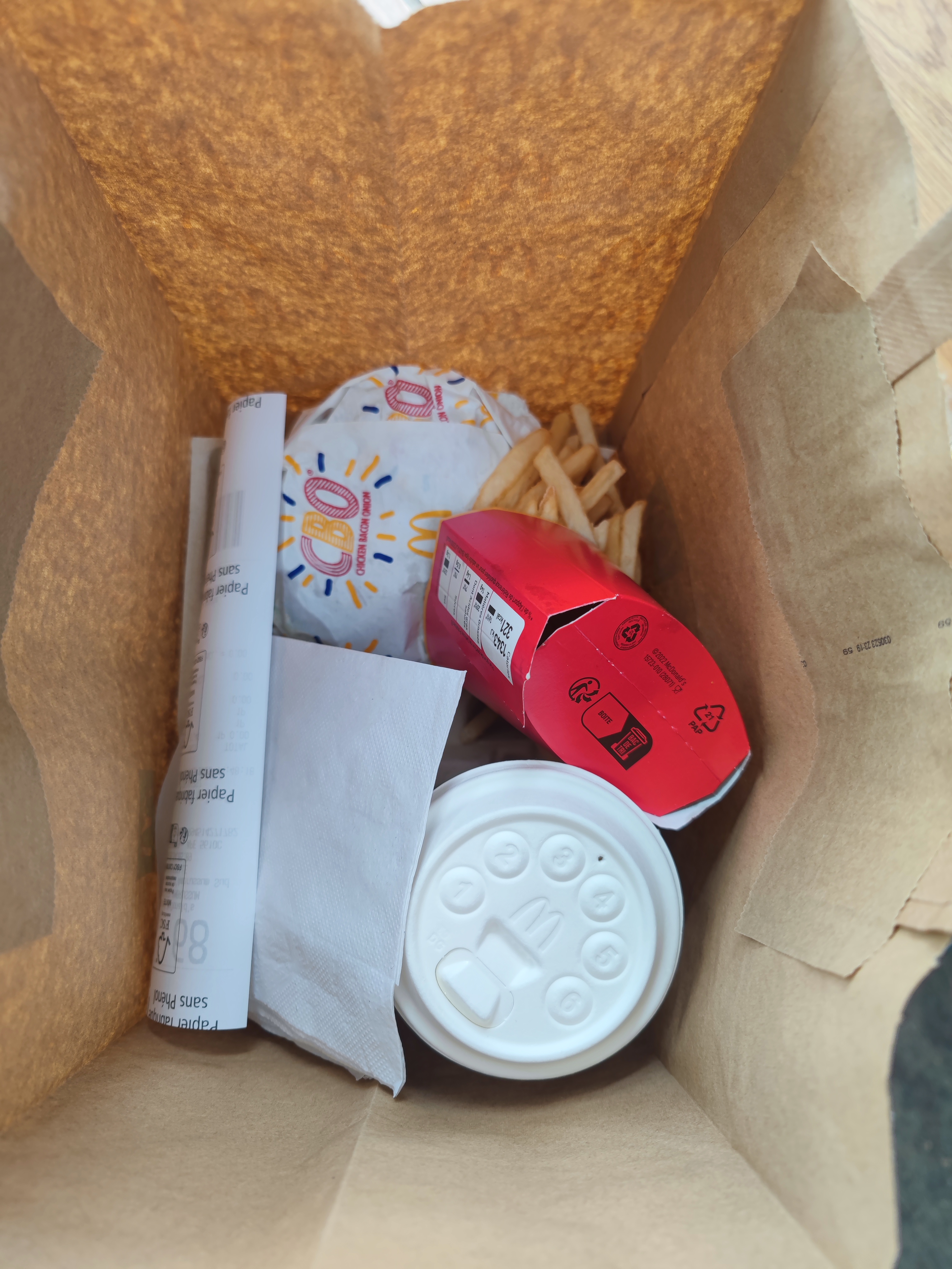 Plusieurs fois maintenant qu on passe par ce macdo, il manque toujours quelque chose dans votre sac, frites,hamburger,sauce. Regardez avant de partir si vous prenez à emporter.
