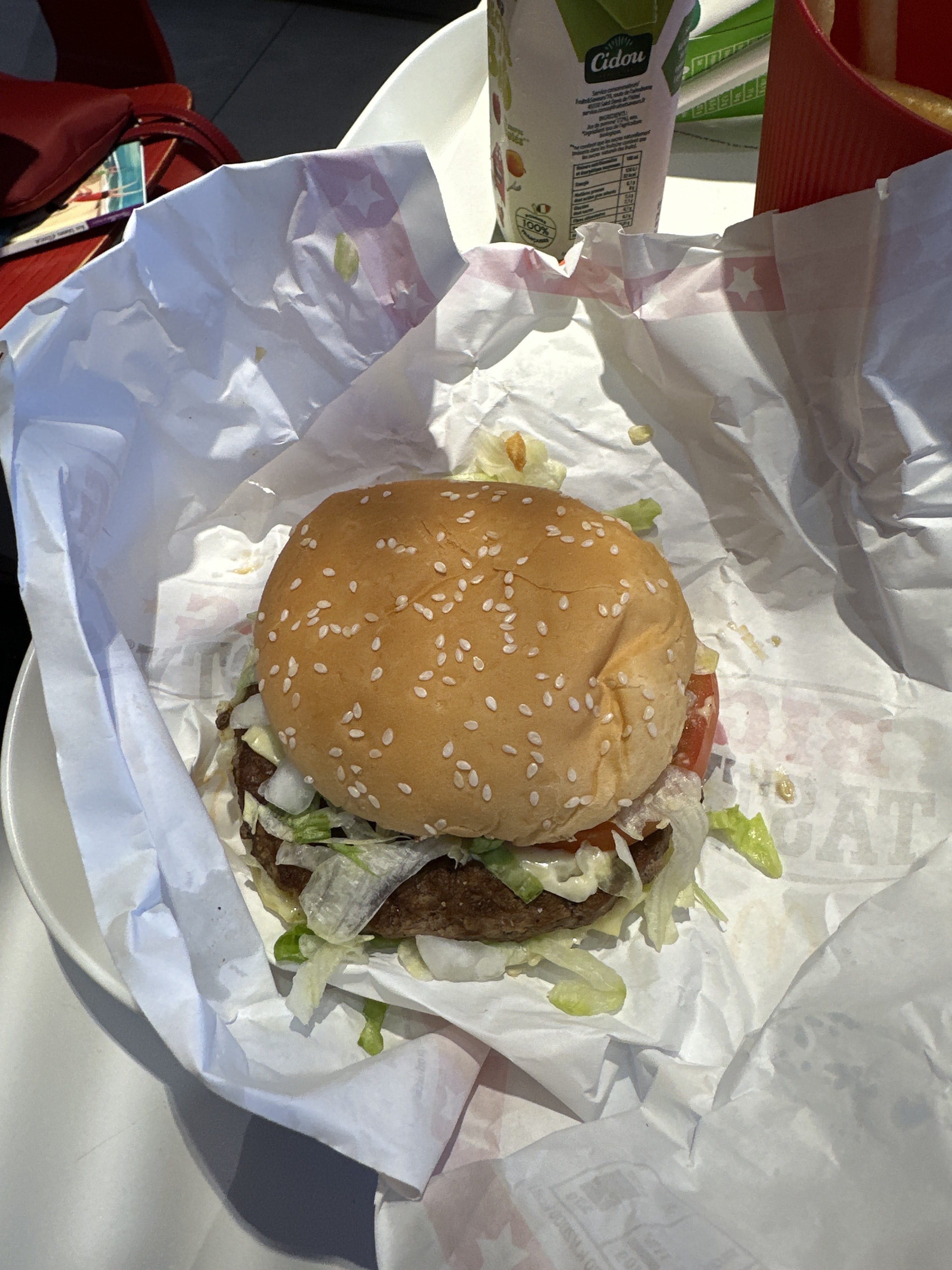 Commande (1 cheeseburger, 1boite de nuggets et petites mangues) faites à 14h30, 14h45 toujours pas servis. Plus de plateaux pour nous servir. Je suis allée la récupérer et les mangues oubliées. Beaucoup trop d'attente. Tables pas nettoyées.