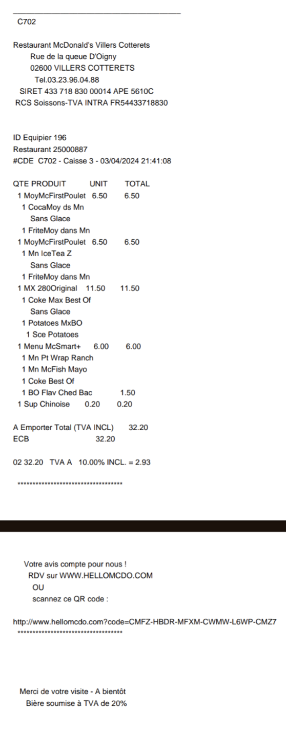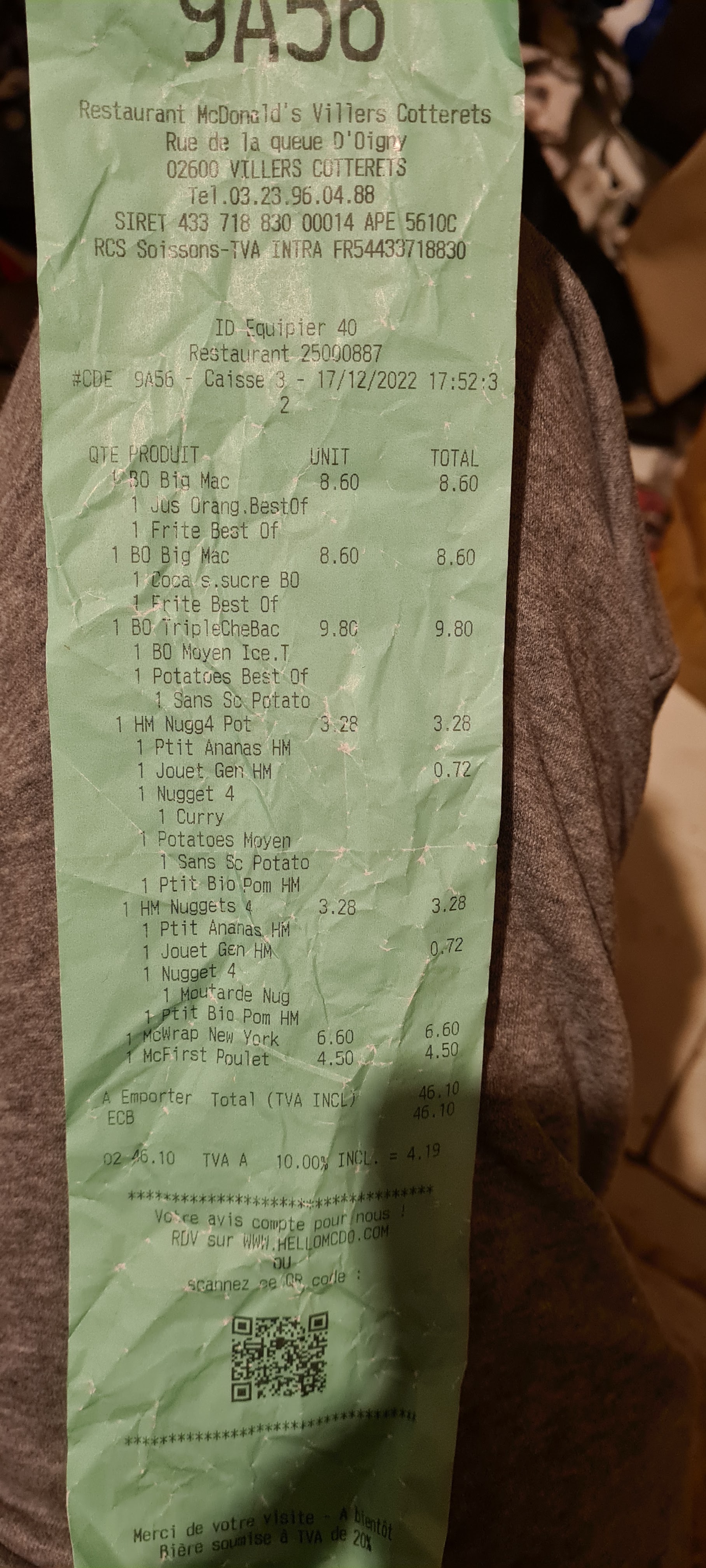 Encore une fois, toutes mes félicitations au MCDONALD'S de Villers cotterets qui ne sait visiblement pas lire les chiffres malgré qu'il y ait une petite ligne en dessous pour différencier le 6 du 9 !!....