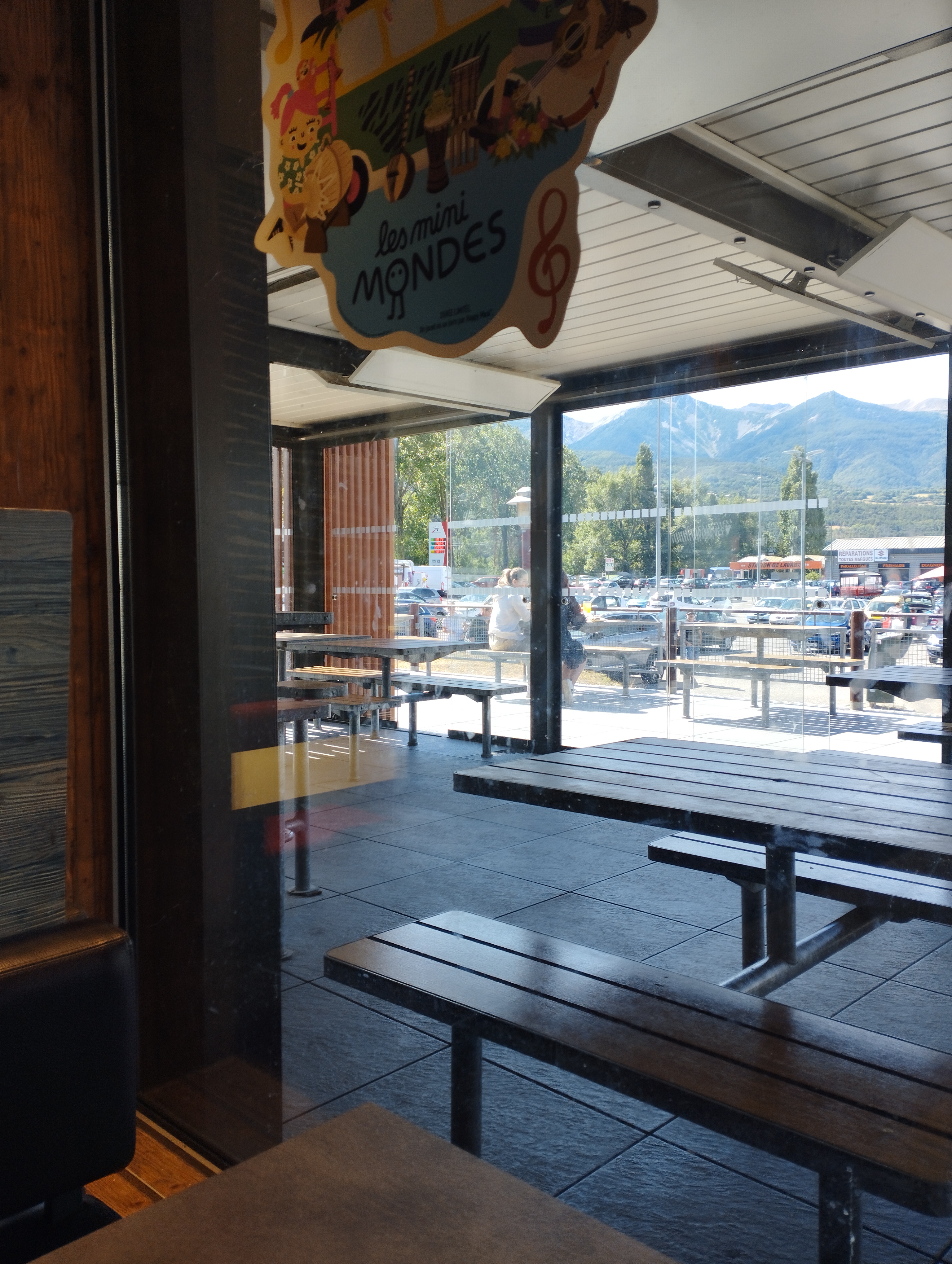 Mac Do qui ressemble à un autre Mac Do…. En extérieur, soleil et vue sur les montagnes environnantes enneigées mais l’on reste prêt d’une route nationale avec du passage et donc du bruit. En même temps on y va pas pour se retrouver comme à la terrasse d’un café… les jeunes sont sympas. En tout cas bien situé en terme d’accessibilité.