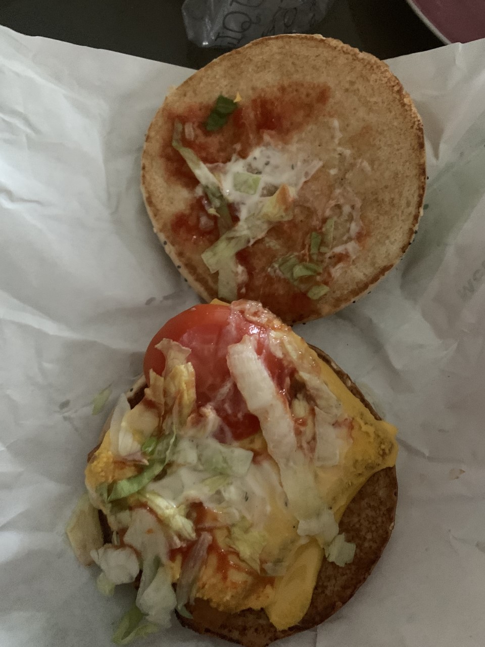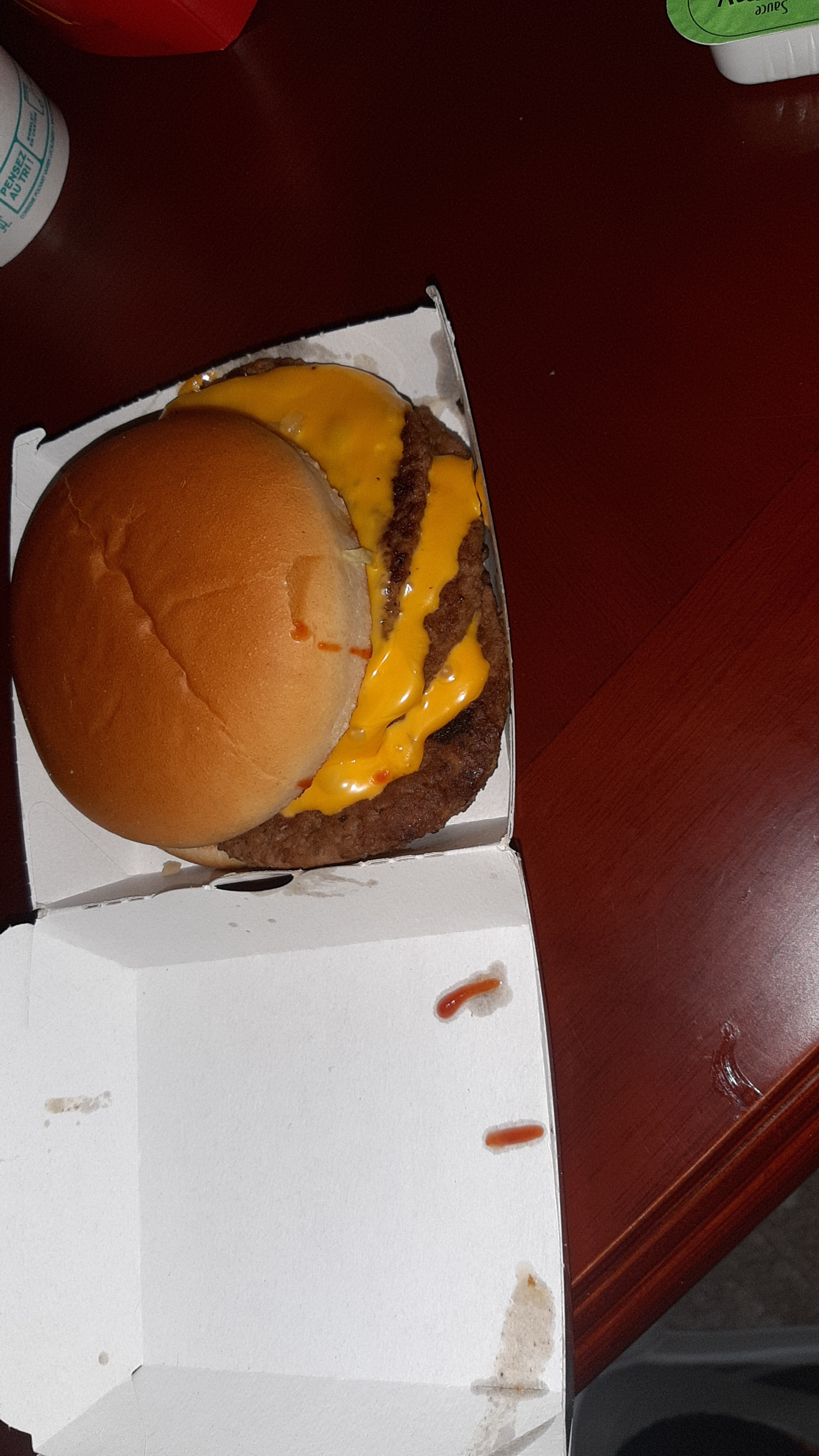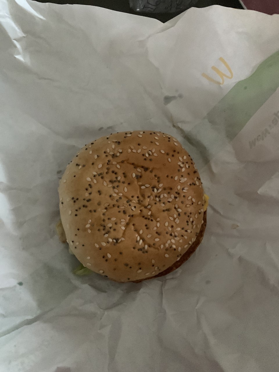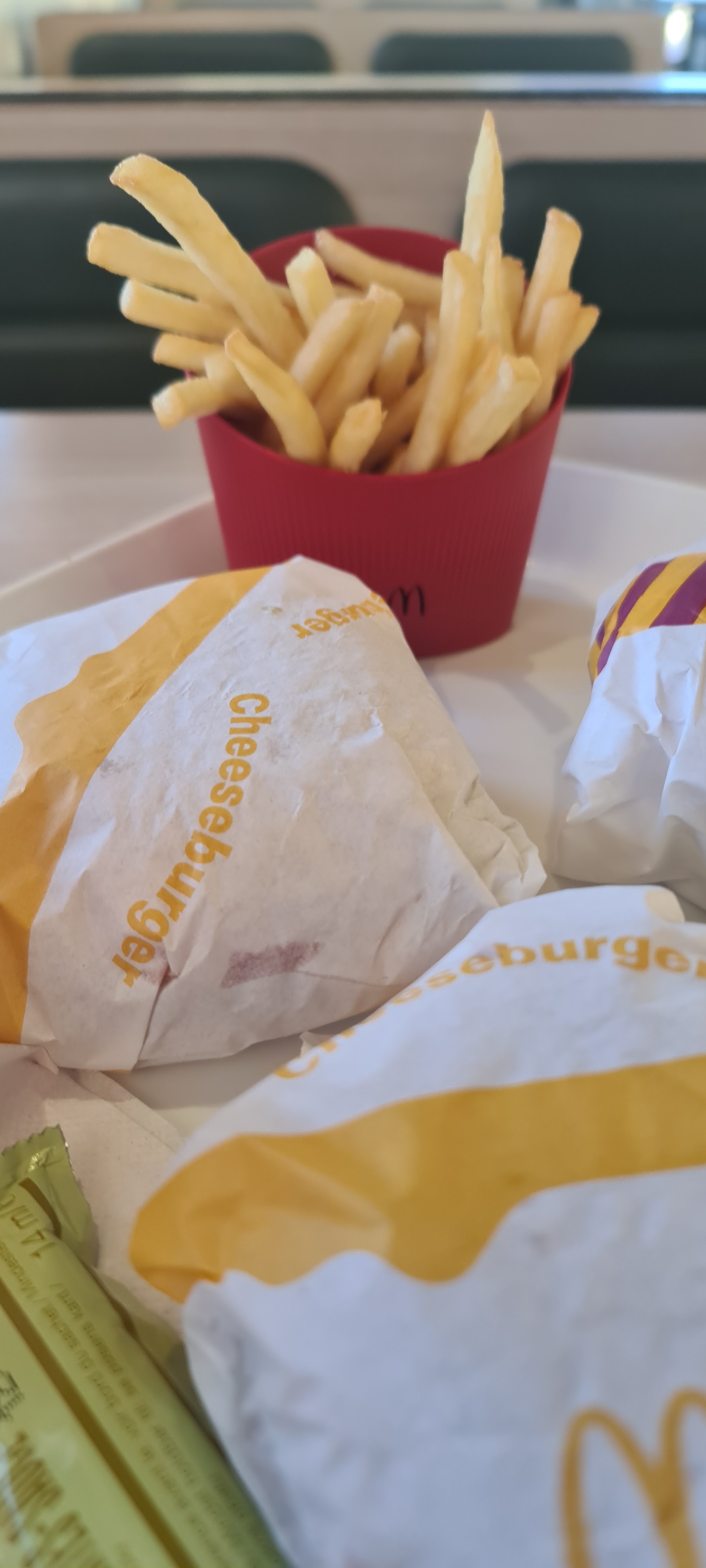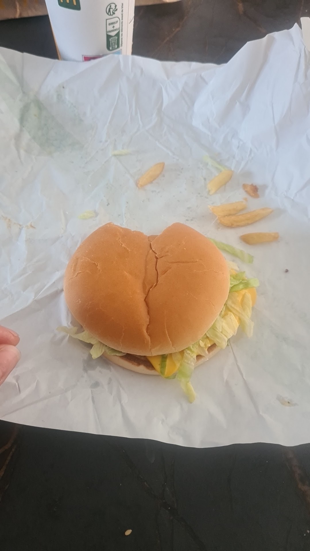 J’ai jamais vu des hamburgers de macdo aussi peu rempli avec seulement un minuscule cornichon, la moitié d’un bout de bacon et une viande plus que cuite. Le sachet de potatoes était même pas rempli jusqu’à la moitié et pour finir l’ice tea était tellement dilué à l’eau, qu’on sentait même plus le goût de l’ice tea